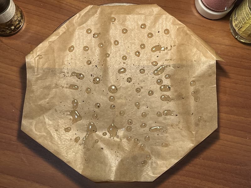 Следом накапали на пергамент немного растительного масла, посыпали молотым перцем и солью и выложили первый ряд картофеля.