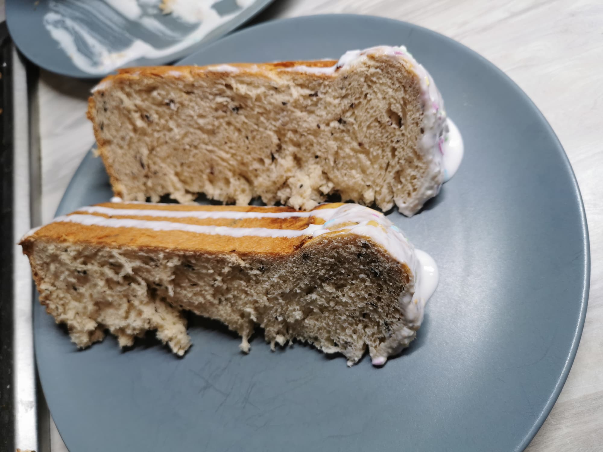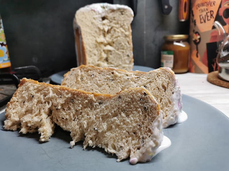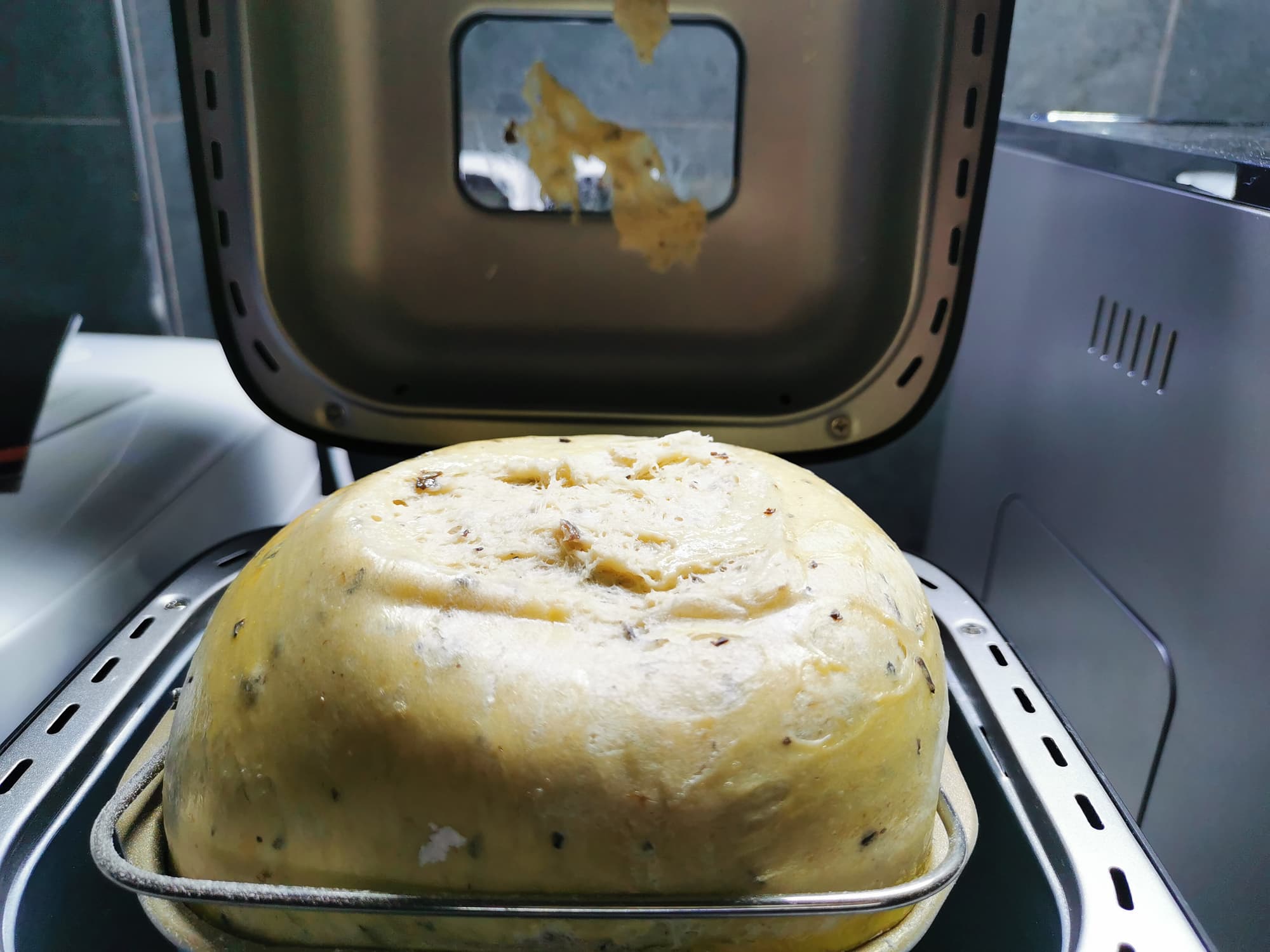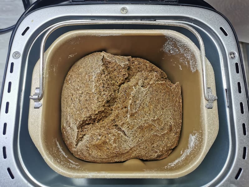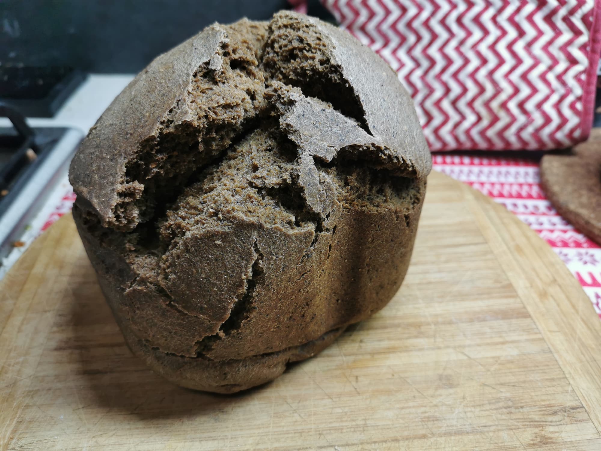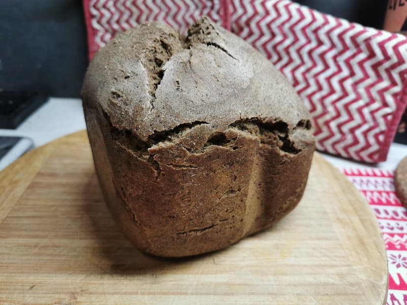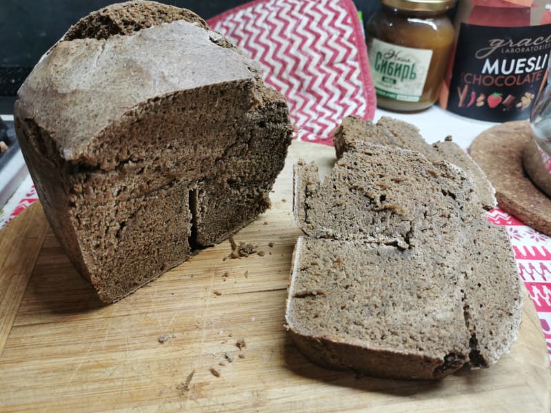 По завершению программы мы получили в целом готовый, но выглядящий несколько сыровато хлеб с характерным ржаным вкусом и привкусом тмина.