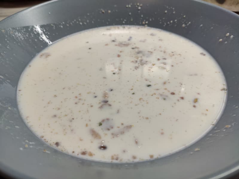 По истечении заданного времени мы обнаружили в чаше большое количество молока, в котором плавали распаренные хлопья. На кашу это похоже не было. Впрочем, чего тут можно ожидать, когда в рецепте предлагается взять 800 мл молока и всего 100 грамм хлопьев?