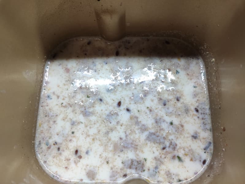 Перед началом приготовления ингредиенты нужно было выложить в хлебопечь в следующей последовательности: вода, сахар, соль, мед, дрожжи, солод, кориандр молотый, тмин цельный, мускатный орех, масло растительное, мука пшеничная, мука ржаная, мука цельнозерновая.