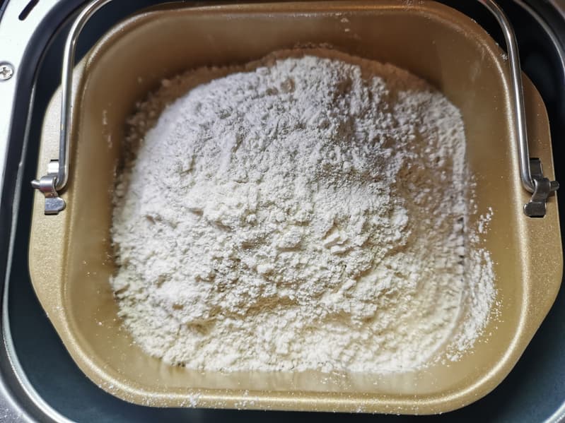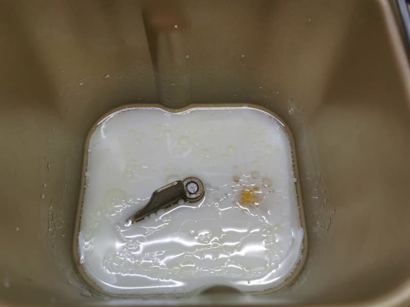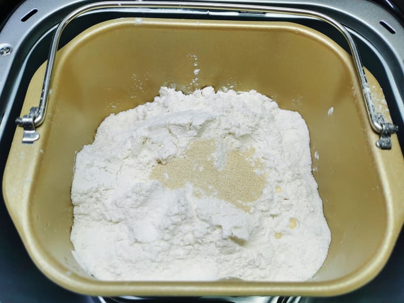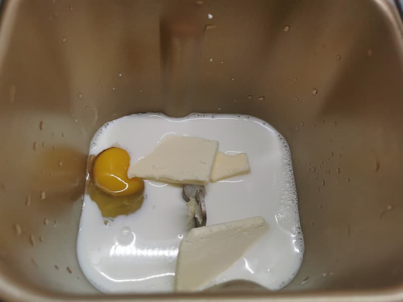 Для приготовления белого хлеба мы, согласно рецепту, поместили ингредиенты в хлебопечь в следующей последовательности: вода, молоко, яйца, соль, сахар, масло растительное, мука пшеничная, дрожжи.