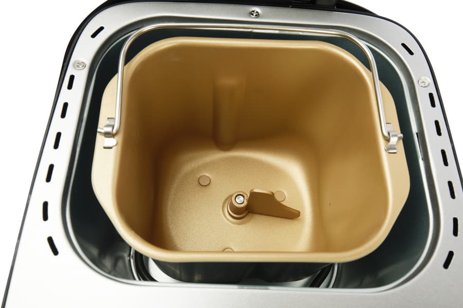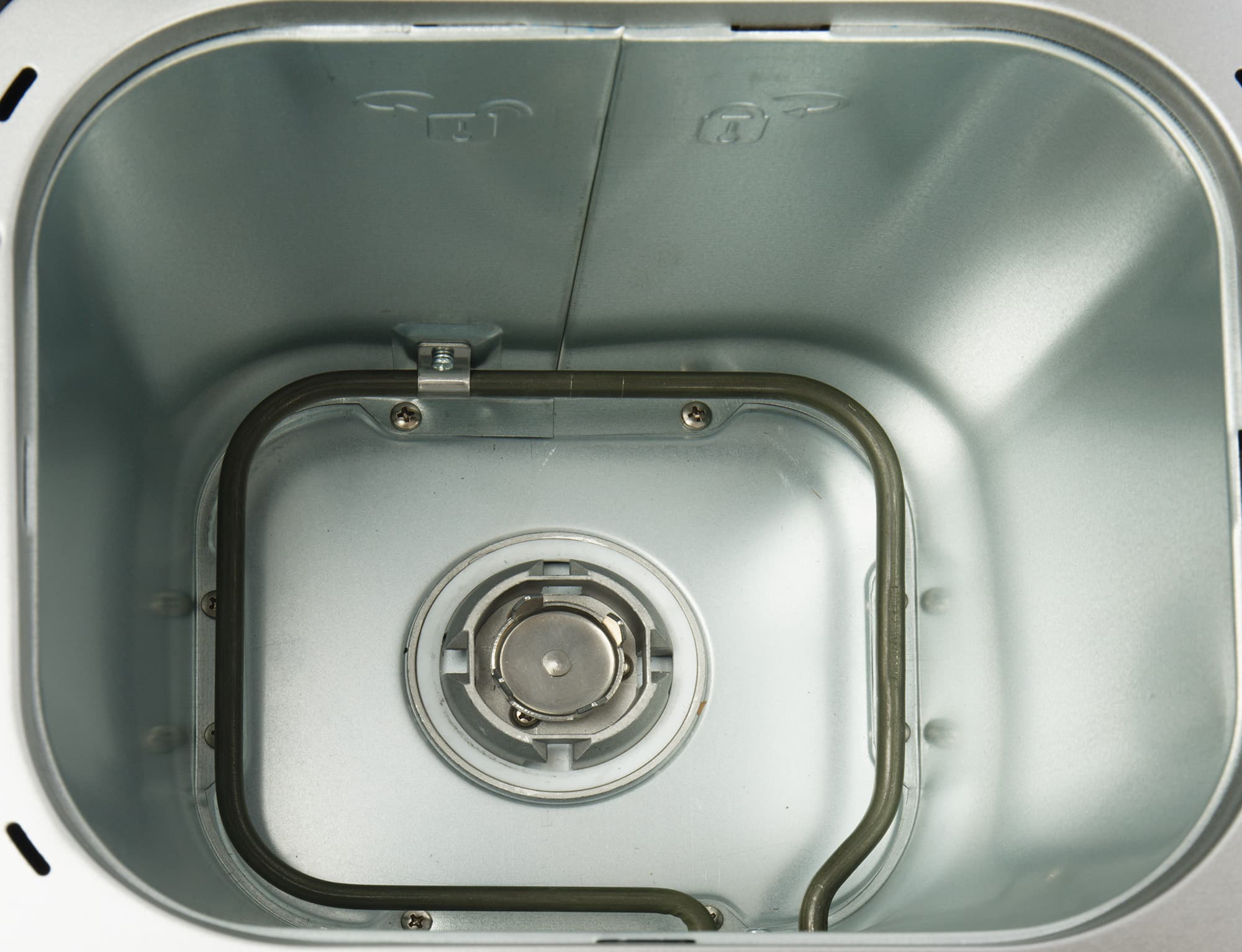 Рабочая камера хлебопечи выглядит стандартно: металлический корпус, по периметру которого расположен нагревательный элемент и байонет для установки чаши. Тэн находится на некоторой высоте от дна, благодаря чему можно без особого труда очистить дно рабочей камеры. Металлический байонет также выглядит стандартно: чаша устанавливается путем поворота на несколько градусов, о чем есть соответствующие пометки-подсказки прямо на внутренней стороне рабочей камеры.