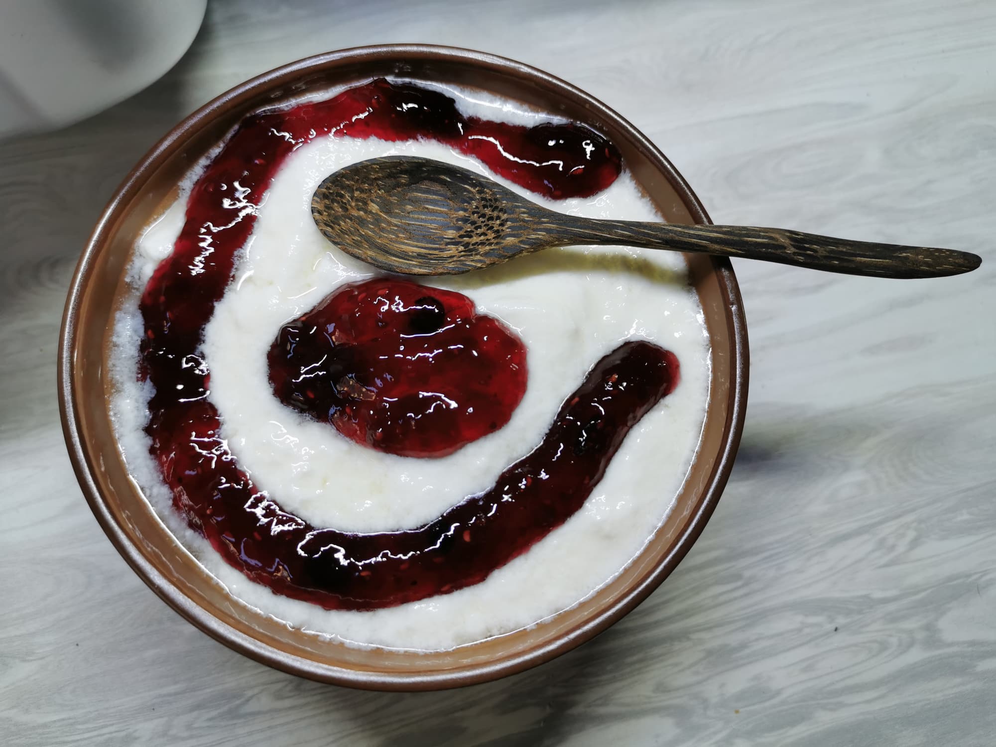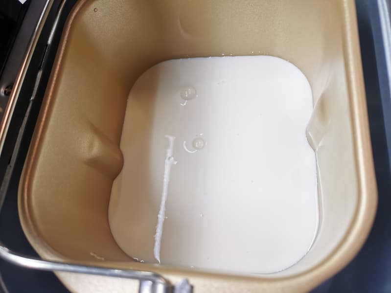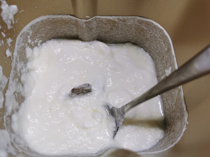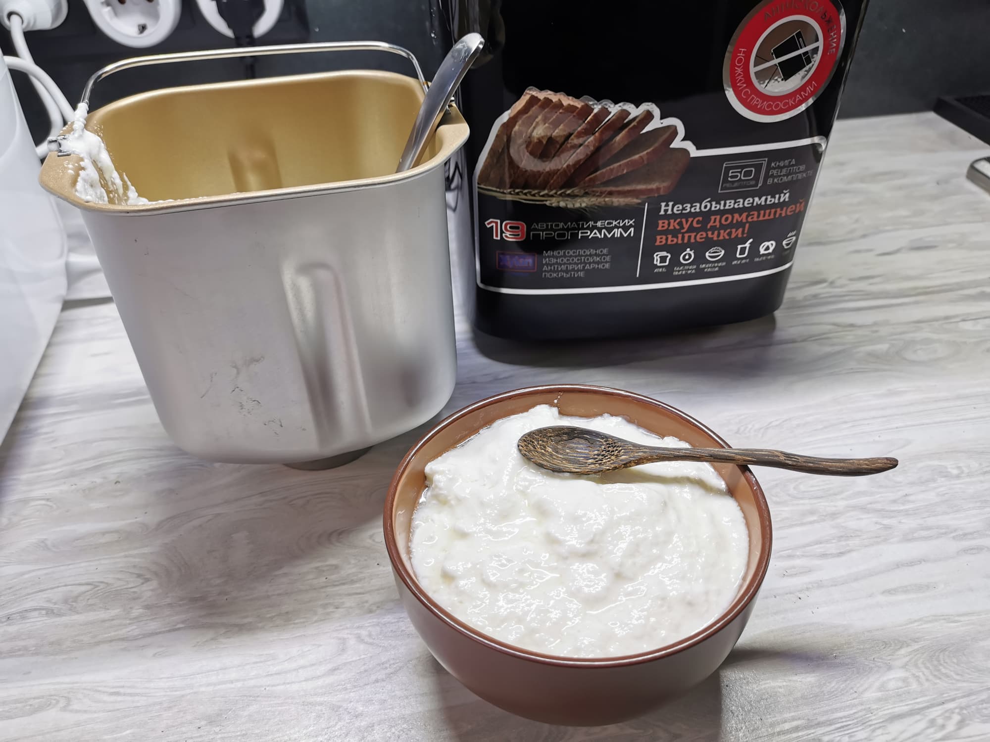 Соединили все ингредиенты, тщательно перемешали и запустили хлебопечь на программе «Йогурт» на 12 часов.