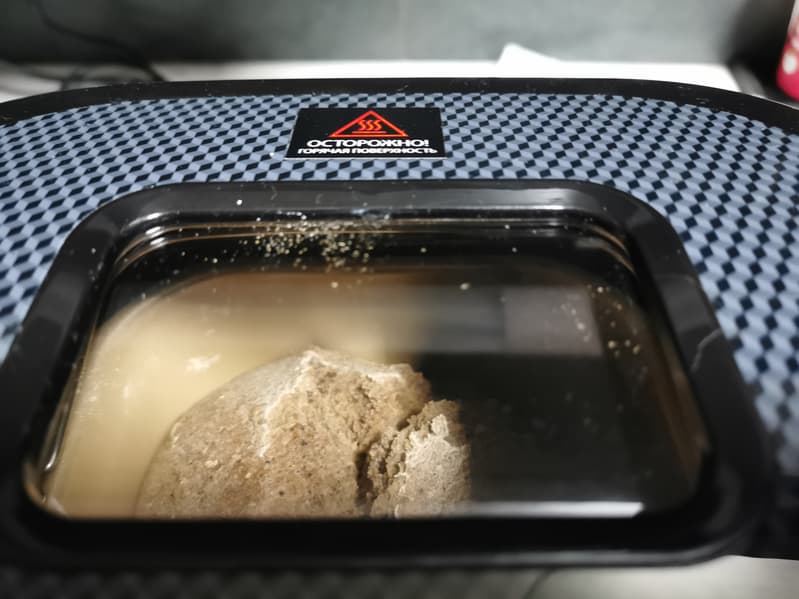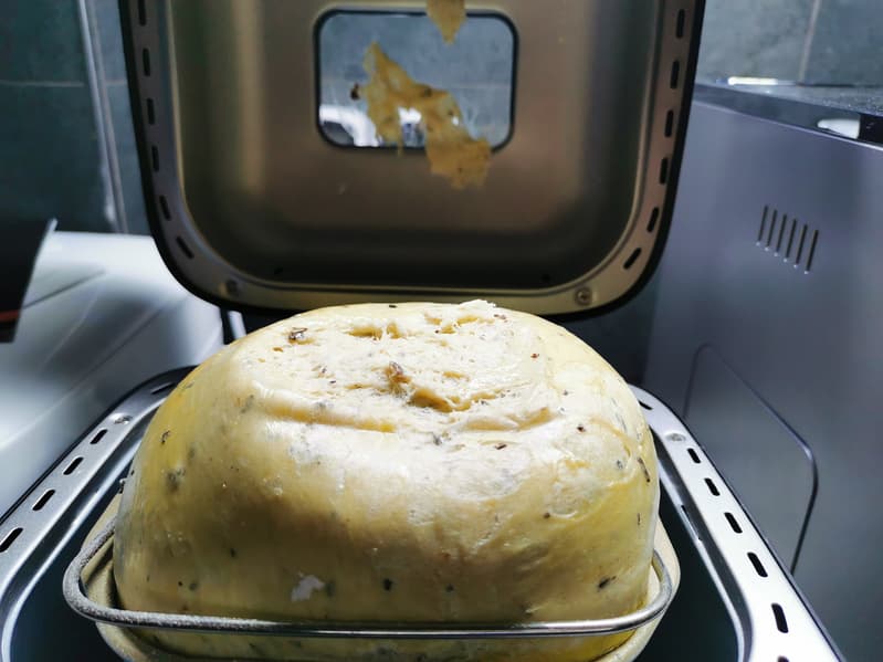 За 1 час до окончания программы нам предстояло взбить яйцо, открыть крышку и смазать им поднявшееся тесто. На этом этапе мы заметили, что тесто поднялось слишком сильно: оно даже прилипло к смотровому окну.