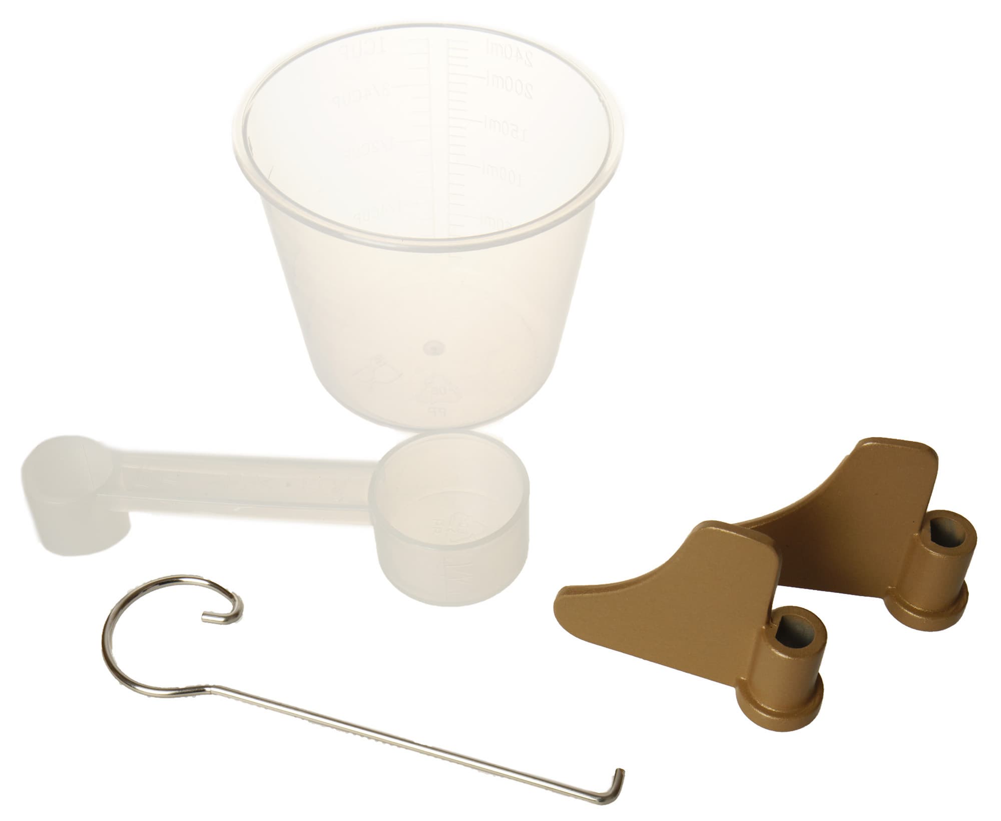 В комплекте с прибором идут аксессуары — мерная ложка, мерный стакан и крюк для извлечения лопатки из теста. Этим же крюком можно доставать горячую форму из хлебопечки за ручку.