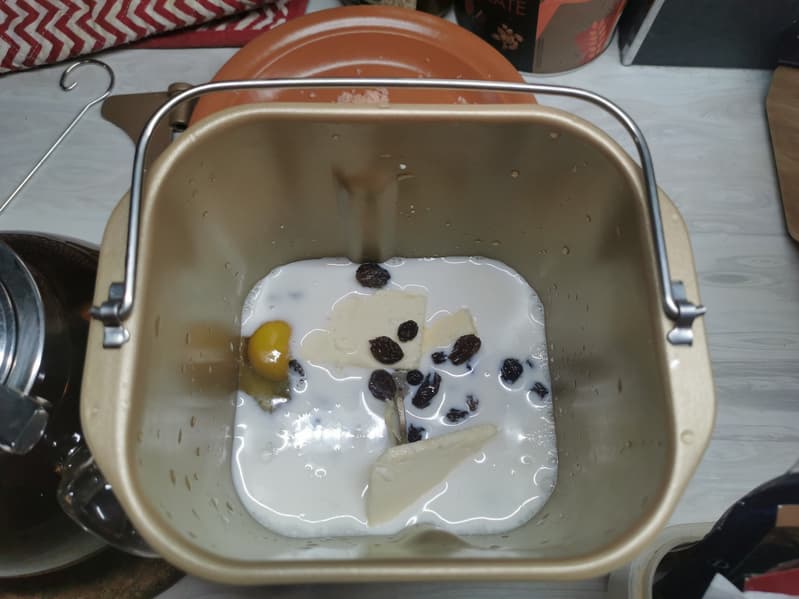 Для приготовления кулича мы последовательно поместили в хлебопечь следующие ингредиенты: 160 мл молока, 1 яйцо, ст. л. ванильного сахара, 0,5 ч.л соли, 3 ст. л. сахара, 30 г сливочного масла, 40 г изюма, 480 г пшеничной муки и 1,5 чайных ложки сухих дрожжей. После этого закрыли крышку и установили программу «Сдоба», вес — 750 г, цвет корочки — «Средний».