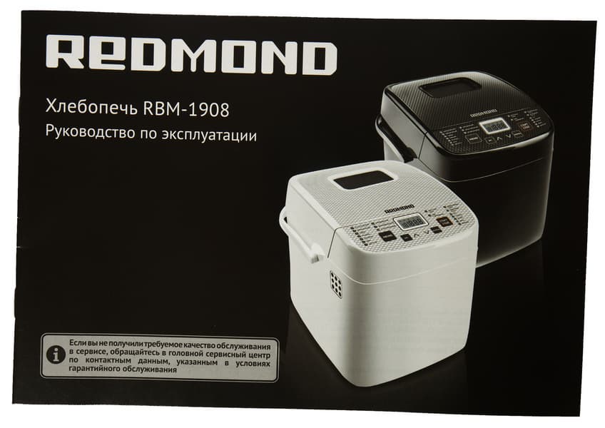 Инструкция, прилагаемая к хлебопечке, как и упаковка, оказалась выполнена по единому стандарту, принятому в Redmond. Это 31-страничная брошюра небольшого формата, отпечатанная на качественной глянцевой бумаге. На долю русского языка приходится 15 страниц, на которых можно найти всю необходимую информацию о работе с прибором — начиная с правил использования и описания возможностей программ, и заканчивая советами по приготовлению.