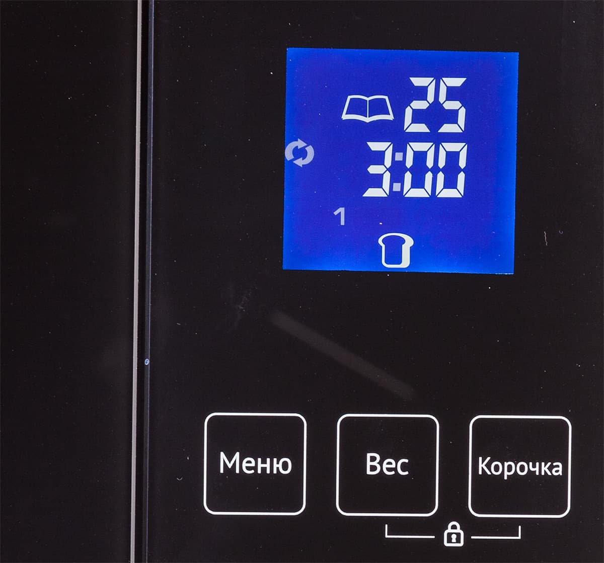 Дисплей имеет подсветку синего цвета, довольно быстро гаснущую и активирующуюся лишь при касании какой-либо кнопки на панели. В режиме ожидания экран серый и на нем темно-серым цветом выделены индикаторы времени, выбранной программы, этапа процесса, установленного веса и цвета корочки. С начала процесса приготовления на экран выводится обратный отсчет времени. В целом все несложно, наглядно и удобно.