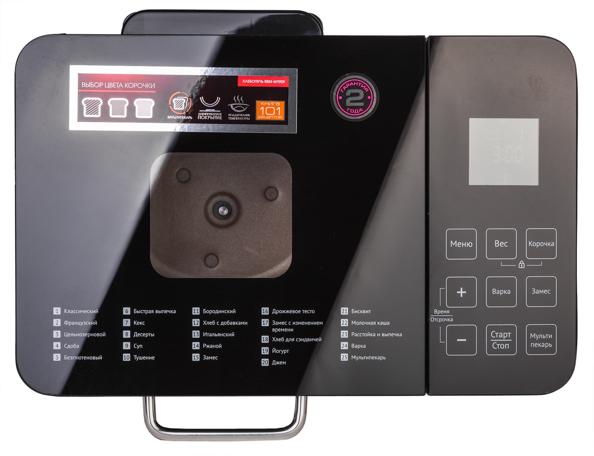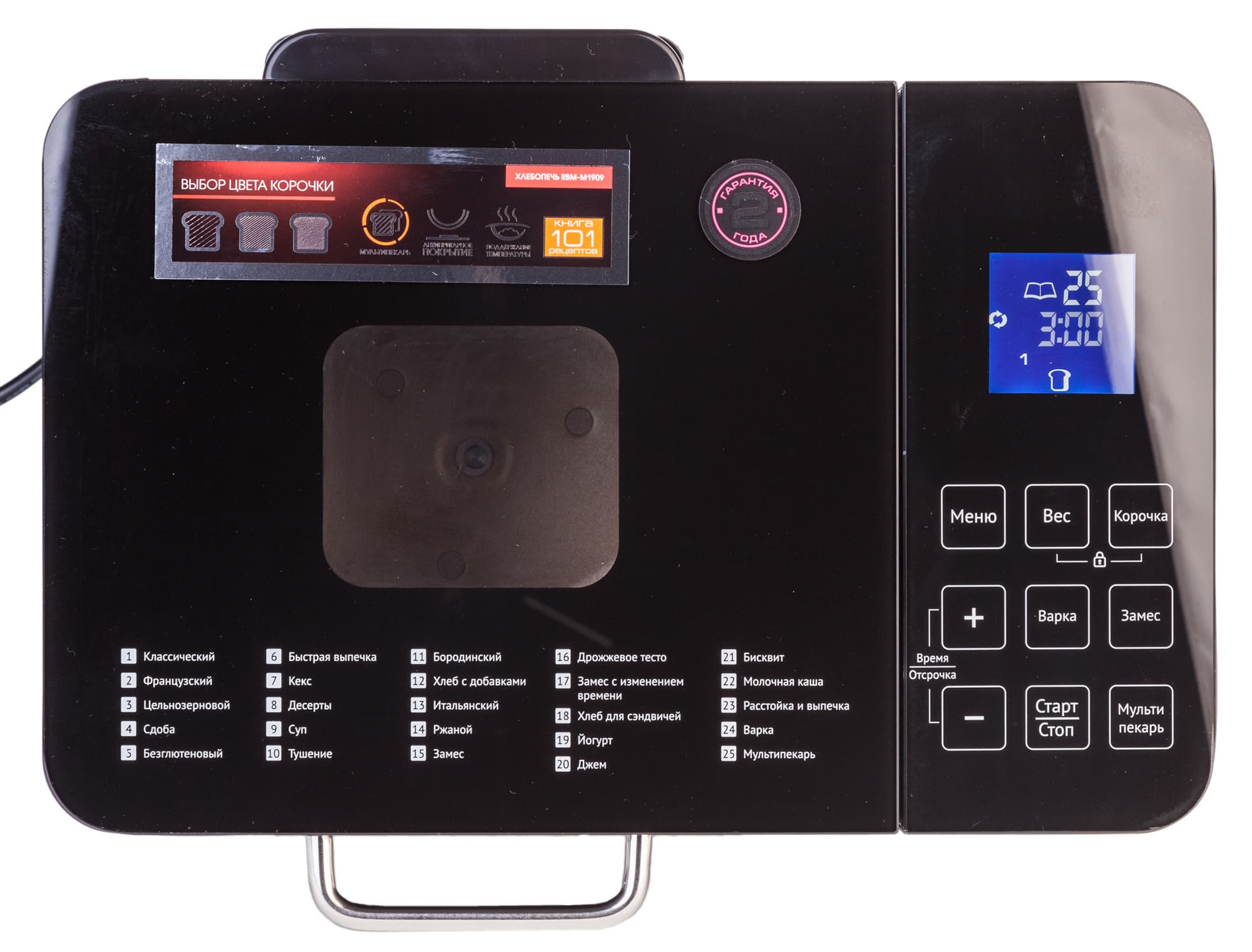 С левой половины верхней части хлебопечки находятся крышка со смотровым окошком и списком режимов, каждый из которых имеет свой порядковый номер. Правую половину занимает панель управления, состоящая из области с девятью сенсорными кнопками и небольшим квадратом ЖК-дисплея. Все просто и наглядно, кнопки управления крупные. Хочется оценить и удобство размещения порядковых номеров и названий режимов прямо на самом корпусе. Так, что пользователю не придется каждый раз сверяться с инструкцией, какой номер какой программе соответствует.