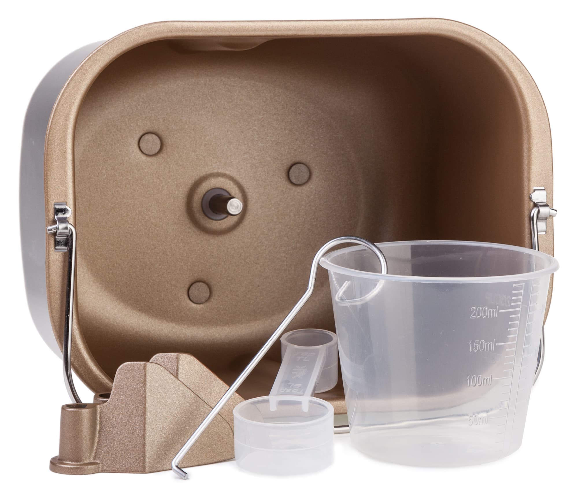 С внутренней стороны на форму для выпечки нанесено гладкое антипригарное покрытие. Что касается аксессуаров, все они качественно исполнены и представляются необходимыми в том случае, если у пользователя нет кухонных весов. Однако мы за все время практических тестов ни разу не воспользовались ни мерным стаканом, ни мерной ложкой, ни крючком для извлечения лопасти для замешивания.