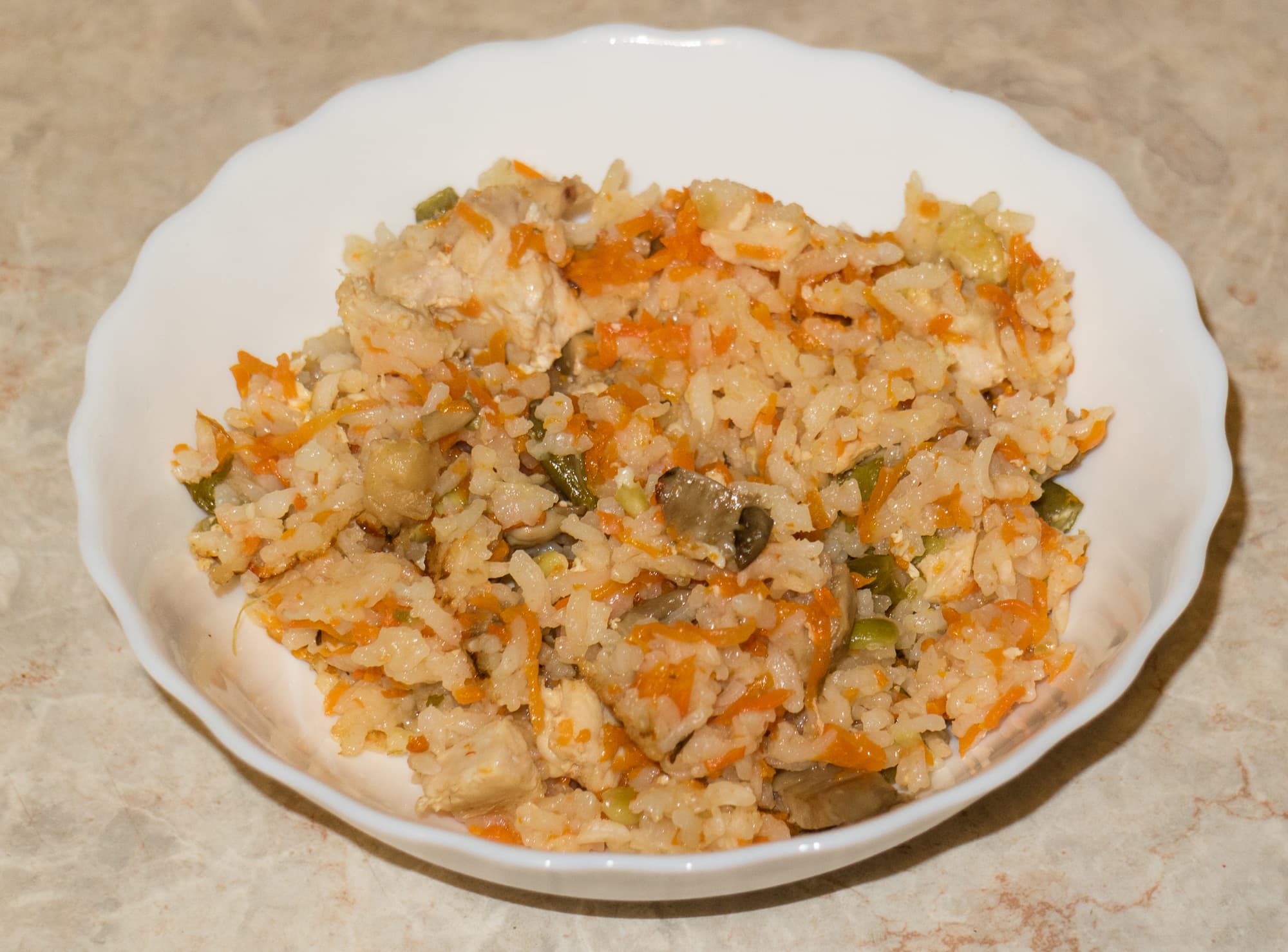 Куриное филе — 400 г, рис — 180 г, морковь — 200 г, шампиньоны — 100 г, горошек консервированный — 50 г, вода — 200 мл, соль, специи — по вкусу.