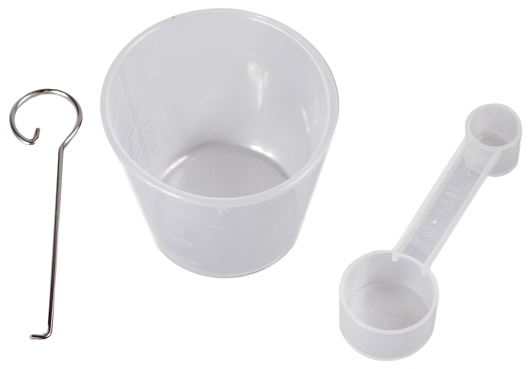 Типовой комплект аксессуаров представлен мерным стаканчиком, мерной ложкой и крюком для извлечения лопасти. Скажем честно, за все время эксплуатации различных хлебопечей мы ни разу не воспользовались последним аксессуаром. Пластиковый стаканчик и ложка могут быть полезны в том случае, если кулинару удобнее пользоваться ими, а не весами, или он достиг той степени мастерства, когда может позволить себе готовить «на глаз». На стенке стаканчика нанесены отметки воды (в мл/чашках) и муки (в чашках). Мерная ложечка позволит отсыпать от ¼ до полной чайной или столовой ложки сухого продукта.