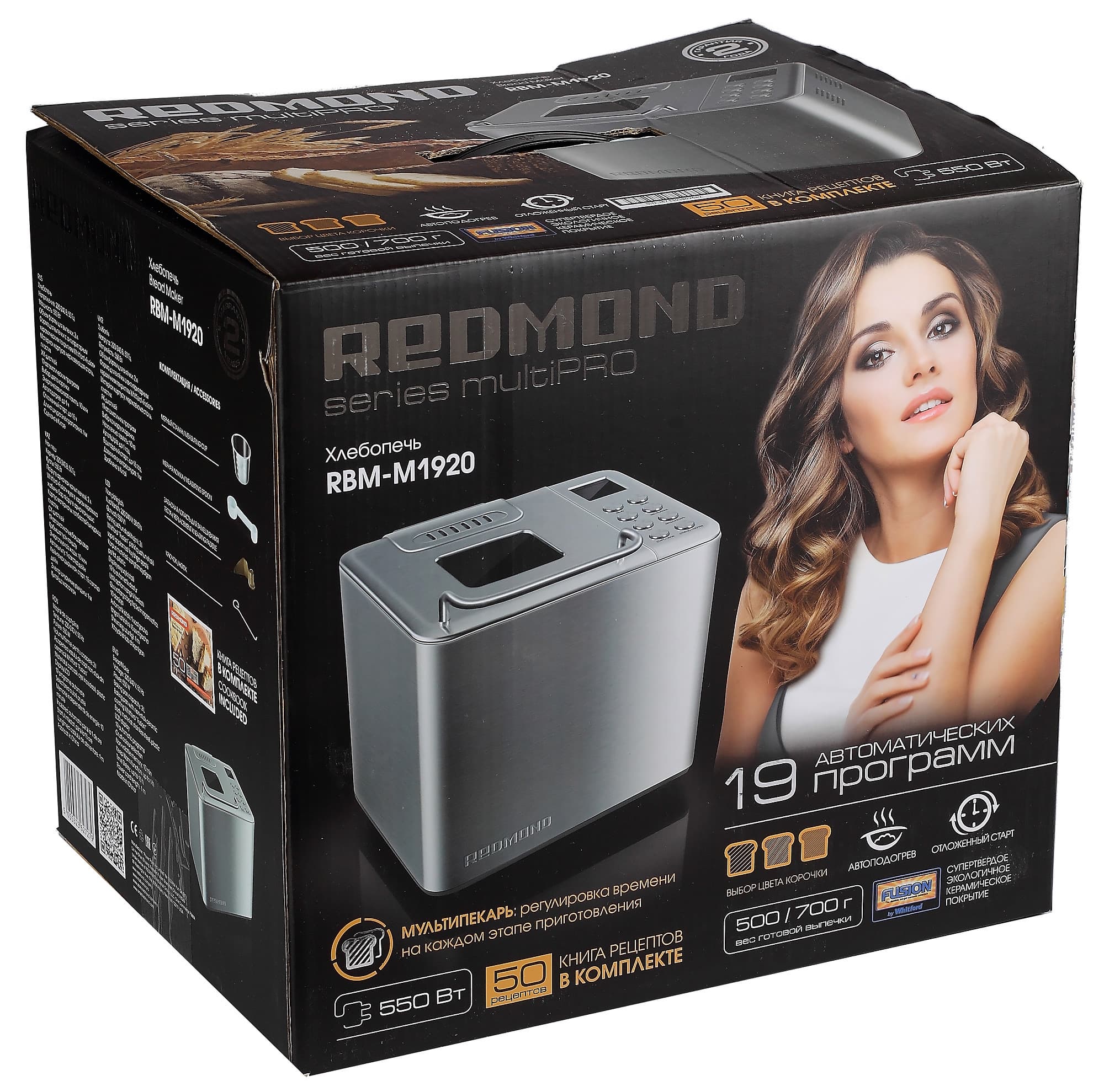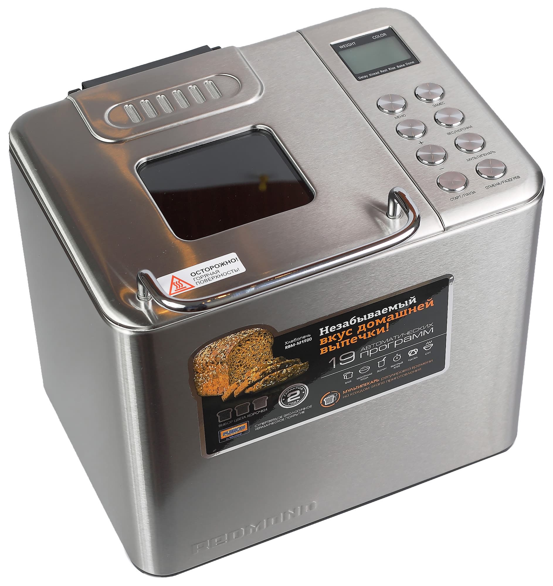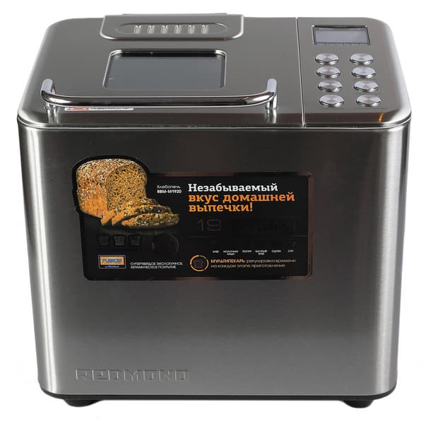 Хлебопечь Redmond RBM-M1920 стильно выглядит и обладает всеми достоинствами приборов этого типа: автоматические программы, отсрочка старта, подогрев готовой выпечки. Redmond предлагает использовать хлебопечь не только для замеса разных типов теста и выпечки, но также варить в ней суп, готовить вторые блюда, варенье и компоты. В книге, входящей в комплект, представлены соответствующие рецепты.