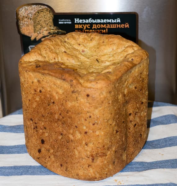 - Высокие буханки получались со слегка проваленной горбушкой. При выпечке хлеба весом в 500 г верхушка была приподнятой и слегка округлой.