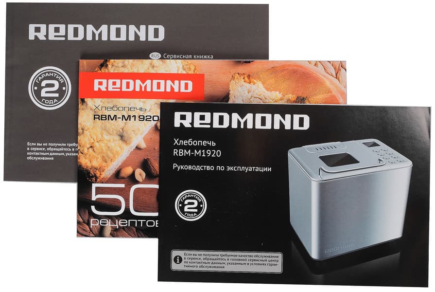 Дополнительно в комплект входит книга рецептов. Первые страницы традиционно представляют рекламные материалы и ряд общих сведений. Пользователь может ознакомиться с таблицей калорийности продуктов, советами поваров Redmond, рекомендациями и требованиями к процессу приготовления. Все 50 рецептов разделены на главы и позволят приготовить не только хлеб или сладкую выпечку, но и каши, супы, вторые блюда и десерты. Стилистика подачи рецепта типична для Redmond: фотография готового блюда на половине страницы, перечень ингредиентов и порядок приготовления — на второй. Для начинающего пользователя книга рецептов может стать незаменимым помощником.
