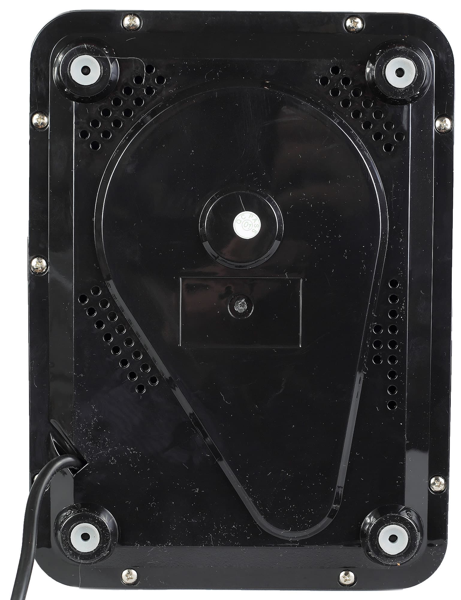 Кроме наличия наклейки с техническими характеристиками прибора, задняя сторона ничем не примечательна. Кабель электропитания подсоединен между задней и нижней панелями. Длина его достаточна для использования в бытовых условиях.