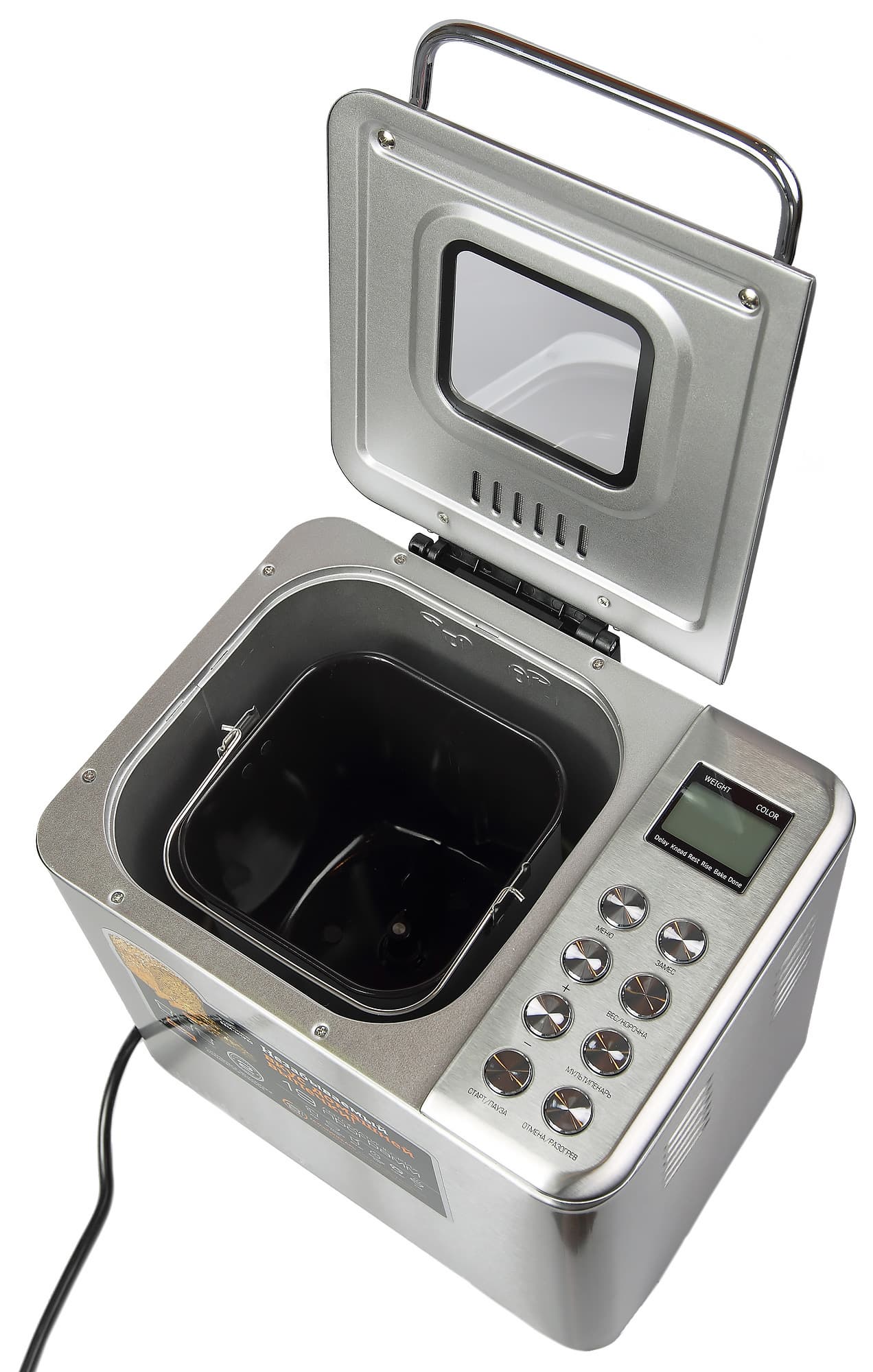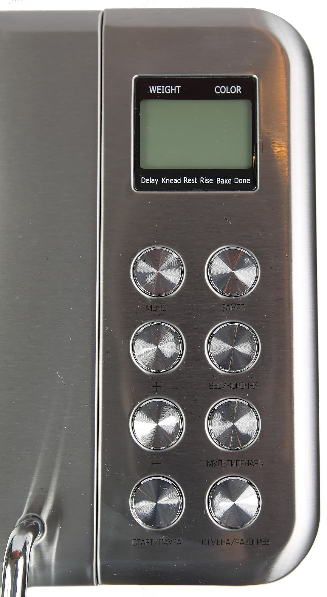 На дисплее отображаются не только выбранные установки (номер программы, вес буханки и степень поджаривания корочки), но и этап приготовления (отсрочка старта, замес, отдых, подъем, выпечка, автоподогрев). Так что пользователь всегда может узнать не только остаток времени до окончания, но и что именно происходит в хлебопечке в данный момент.
