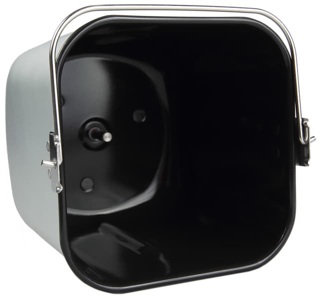 Внутри рабочей камеры на высоте 6,5 см от дна вдоль стенок закреплен нагревательный элемент. По центру находится место установки формы для замеса и выпечки. Сцепляются форма и мотор с помощью соединения байонетного типа. Емкость устанавливается внутрь камеры стандартным движением: размещение под небольшим углом и фиксация поворотом вправо. На внутренней поверхности стенки нанесены подсказки, в каком направлении следует повернуть форму для фиксации или, наоборот, извлечения.