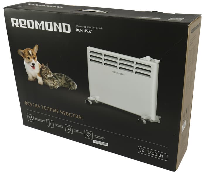 Обогреватель прибыл на тесты в картонной коробке с пластиковой ручкой сверху. Так как вес у прибора небольшой, коробка очень удобна для переноски. Дизайн оформления, как обычно у Redmond в черном цвете, но место привычной красотки теперь заняли очаровательные котик и щеночек. В остальном же, как и раньше — качественное фото прибора, технические характеристики, служебная информация.