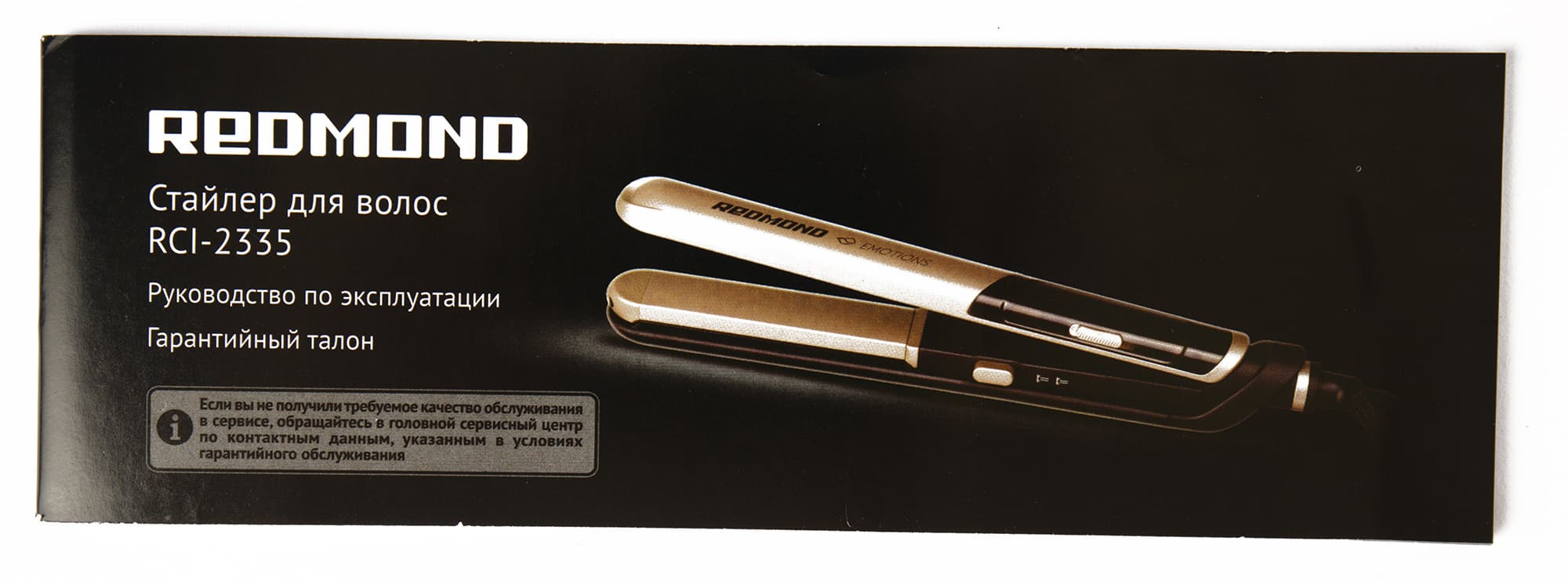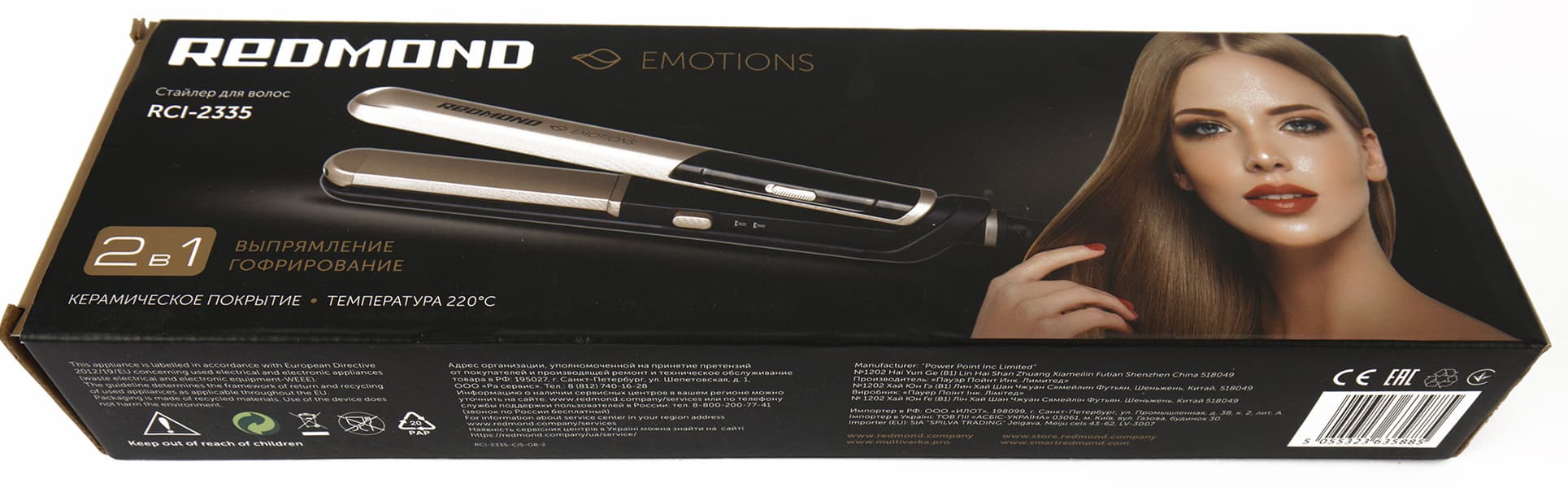 Стайлер поставляется в небольшой прямоугольной коробке из плотного картона с качественной полноцветной печатью. На лицевой стороне, по соседству с логотипом компании и названием устройства, мы видим фото красивой девушки и изображение самого стайлера с кратким описанием основных преимуществ. На обратной стороне — три большие фотографии модели в процессе укладки и описание возможностей устройства, на двух языках: русском и английском. На боковых сторонах напечатаны технические характеристики и данные об изготовителе. На одной из торцевых сторон коробки — QR-код, ведущий на официальный сайт компании, а точнее — на страницу о Redmond RCI-2335 с еще более подробной информацией и отзывами.