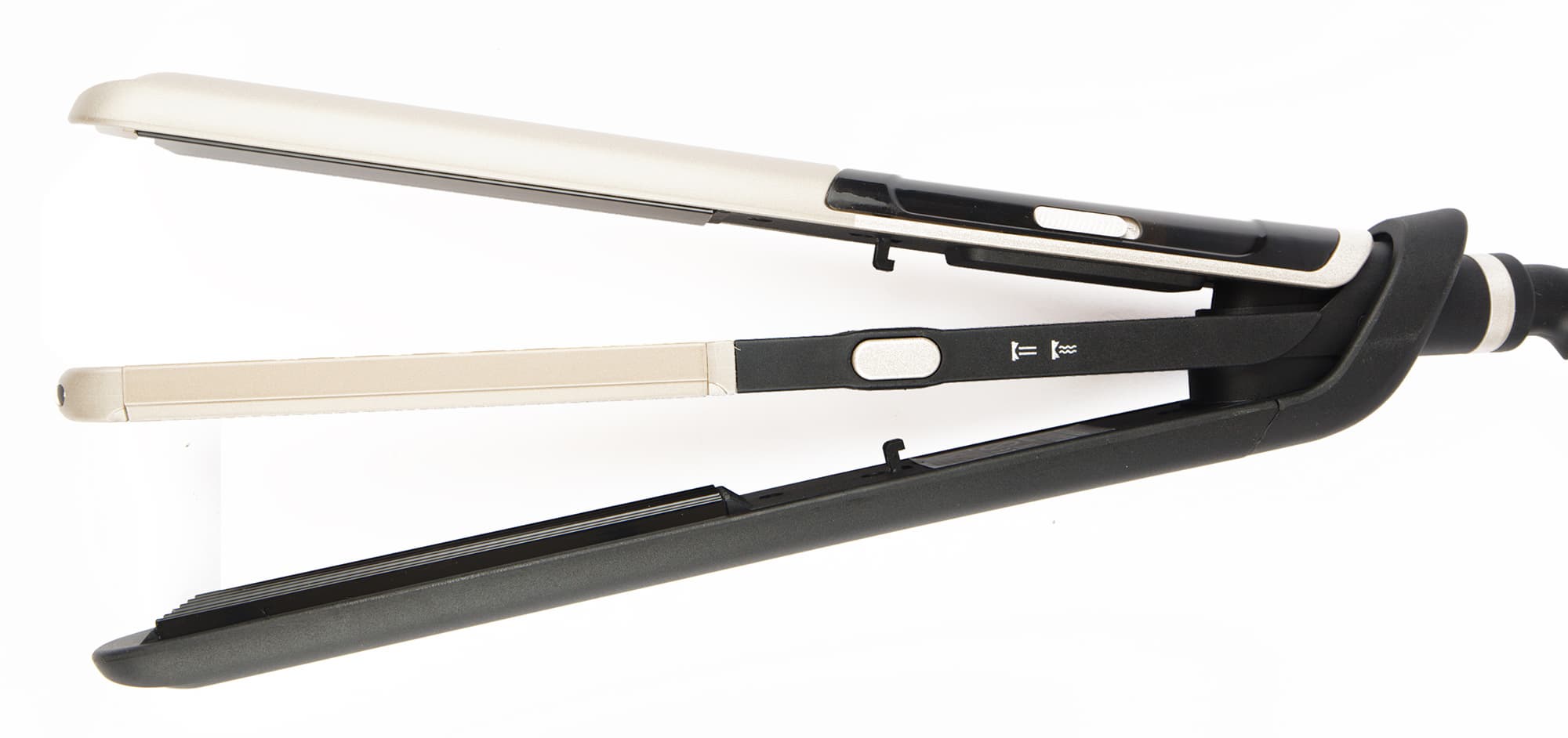 Фиксатор панелей на рукоятке стайлера имеет три положения. Установленный строго посередине, он блокирует и закрывает обе панели, а выдвинутый влево или вправо —раскрывает одну или обе секции одновременно.
