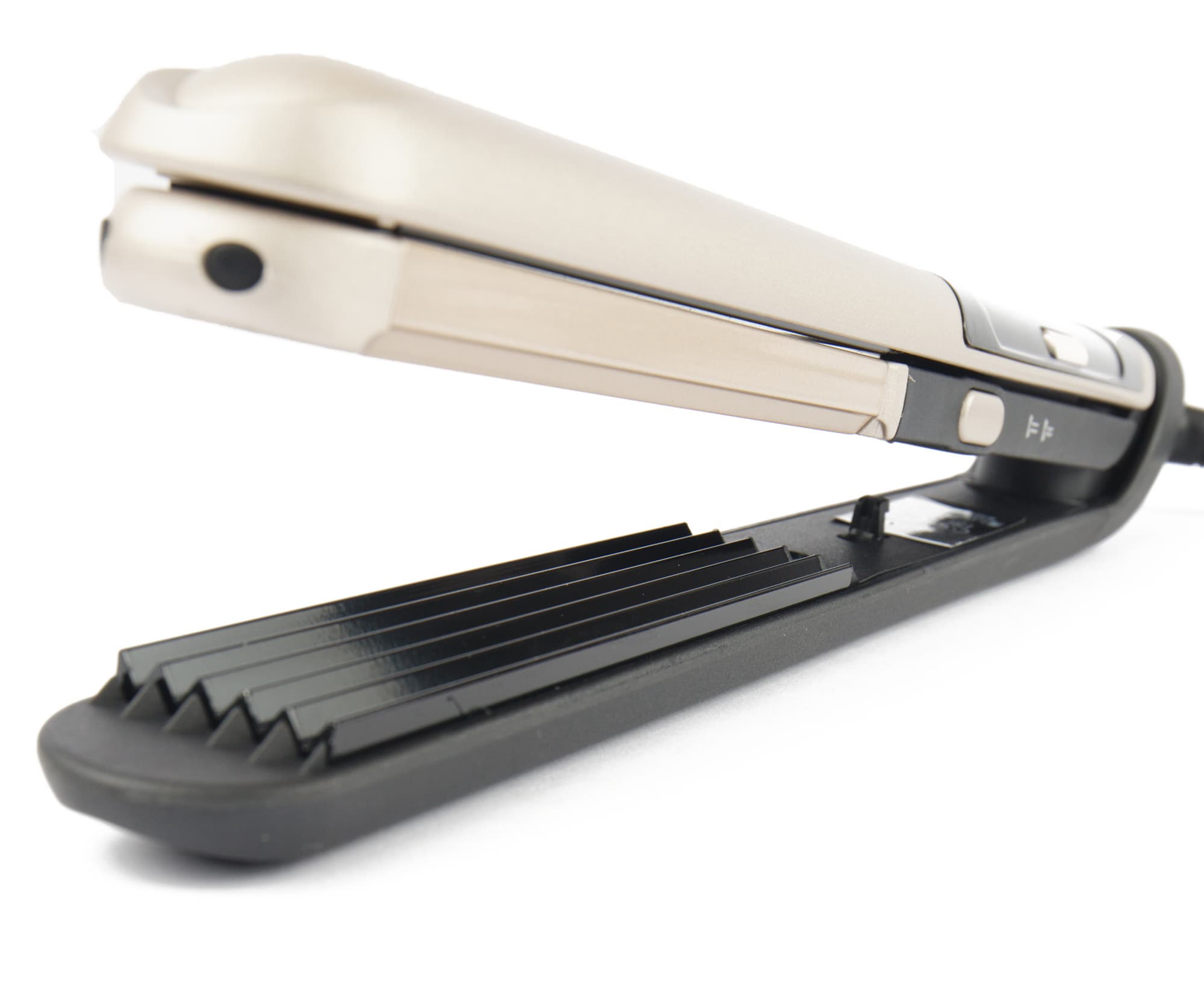 Создание мелкого гофре происходит по тому же принципу, что и выпрямление. С помощью фиксатора мы открыли секцию с пластинами для гофре и зажали прядь у корней примерно на 5 секунд. Разжав щипцы, перехватили прядь несколькими сантиметрами ниже и продолжили двигаться подобным образом до кончиков волос. Результат оказался очень хорош. Довольно быстро мы получили на волосах рельефное, красивое, мелкое гофре, которое также подойдет и для прикорневого объема.