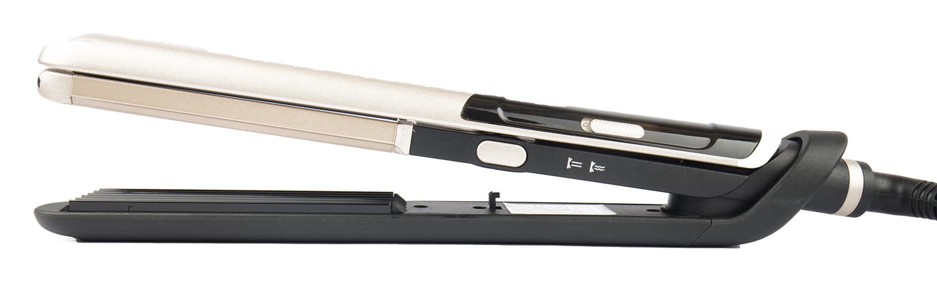 Кнопка включения стайлера и дисплей с индикатором работы располагаются на верхней панели корпуса.