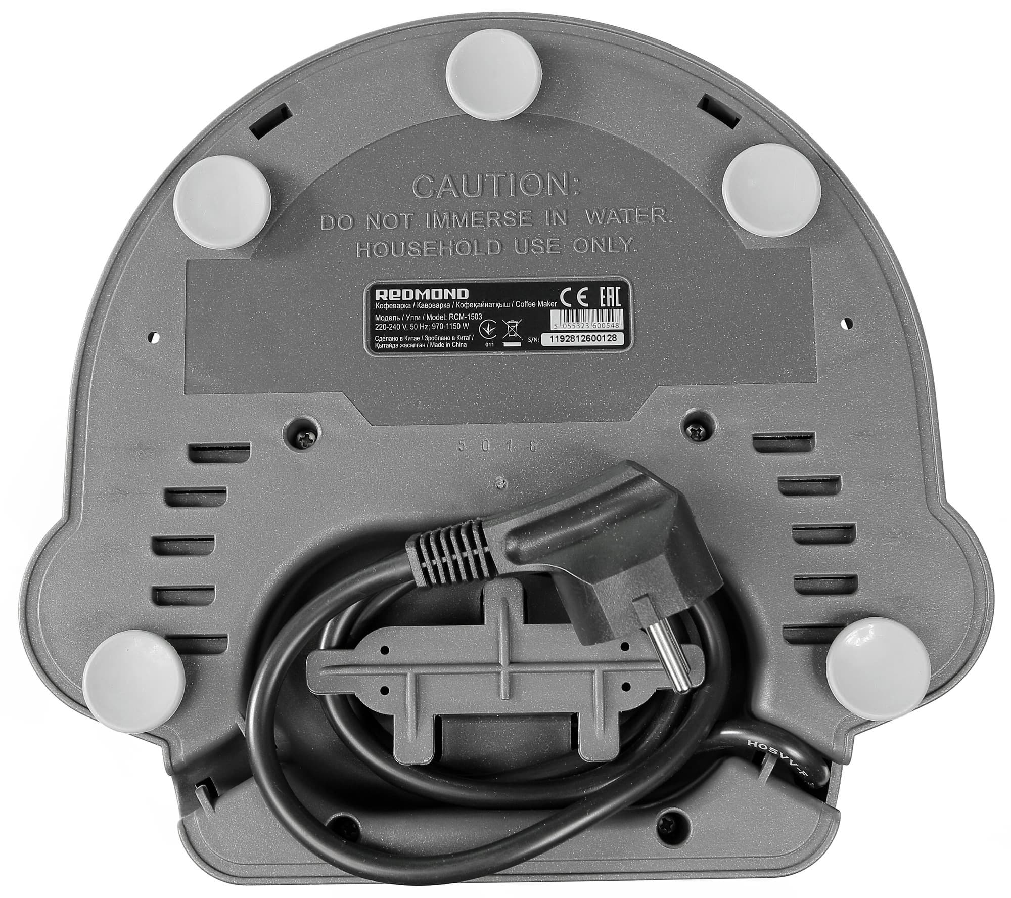 Основание у прибора массивное. В качестве ножек используются присоски, надежно фиксирующие кофеварку на рабочей поверхности. Учитывая немалый вес прибора, его вряд ли удастся не только перевернуть, но даже случайно сдвинуть. Снизу также можно увидеть вентиляционные отверстия и отсек для хранения шнура, позволяющий смотать его лишнюю часть.