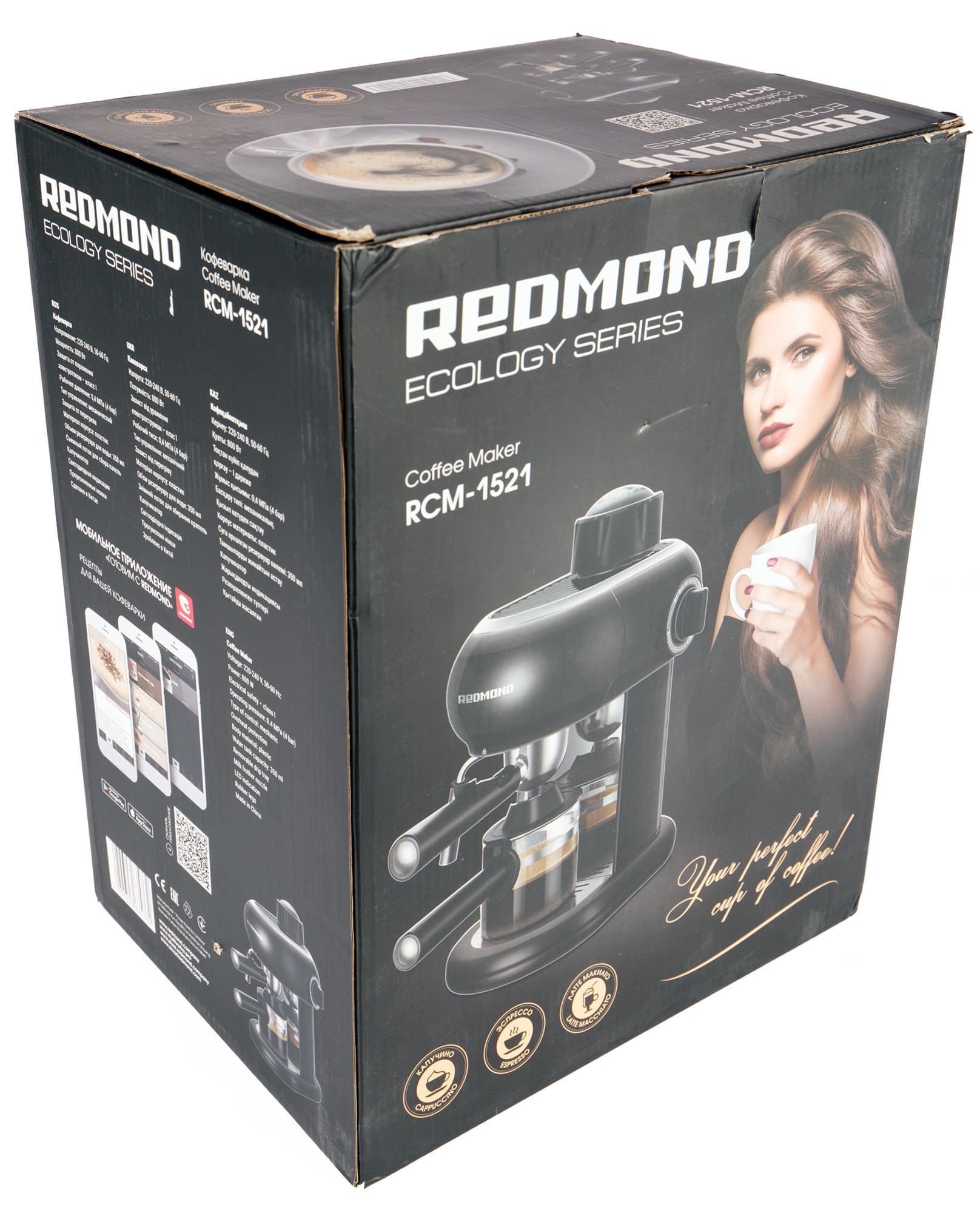 Кофеварка поставляется в картонной коробке, оформленной в фирменном стиле Redmond. Мы увидим хорошо знакомый стиль: фирменные шрифты, строгую цветовую гамму, фотографии самого прибора и описание его основных технических характеристик. Благодаря такому оформлению потенциальный покупатель не только сразу же узнает продукцию Redmond на полках магазинов, но также сможет составить первое впечатление о приборе, не вскрывая коробку.
