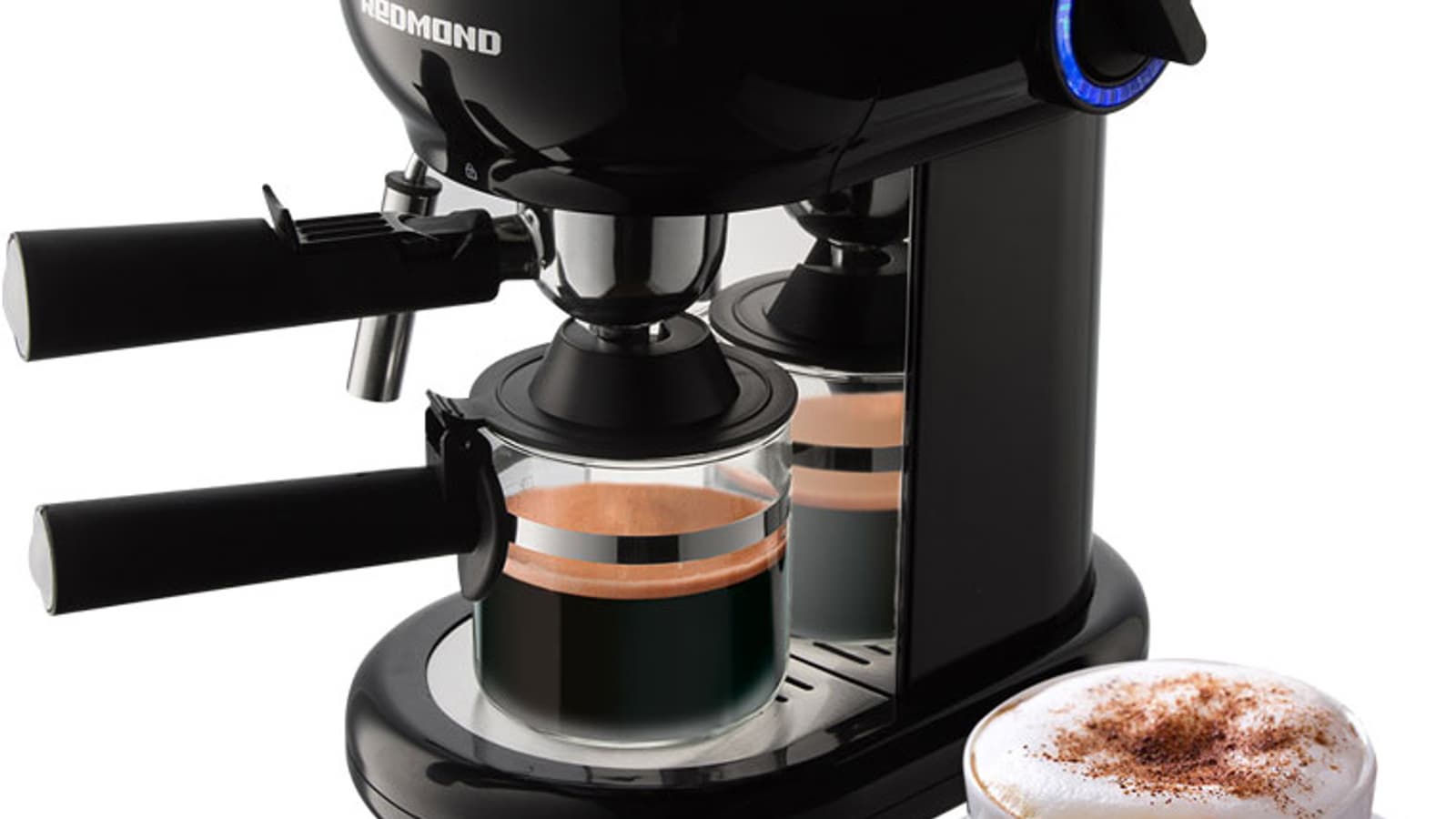 Единственный орган управления кофеваркой — механическая ручка, расположенная на правой грани корпуса и отвечающая за переключение режимов. В процессе работы ручка подсвечивается яркой светодиодной подсветкой синего цвета.