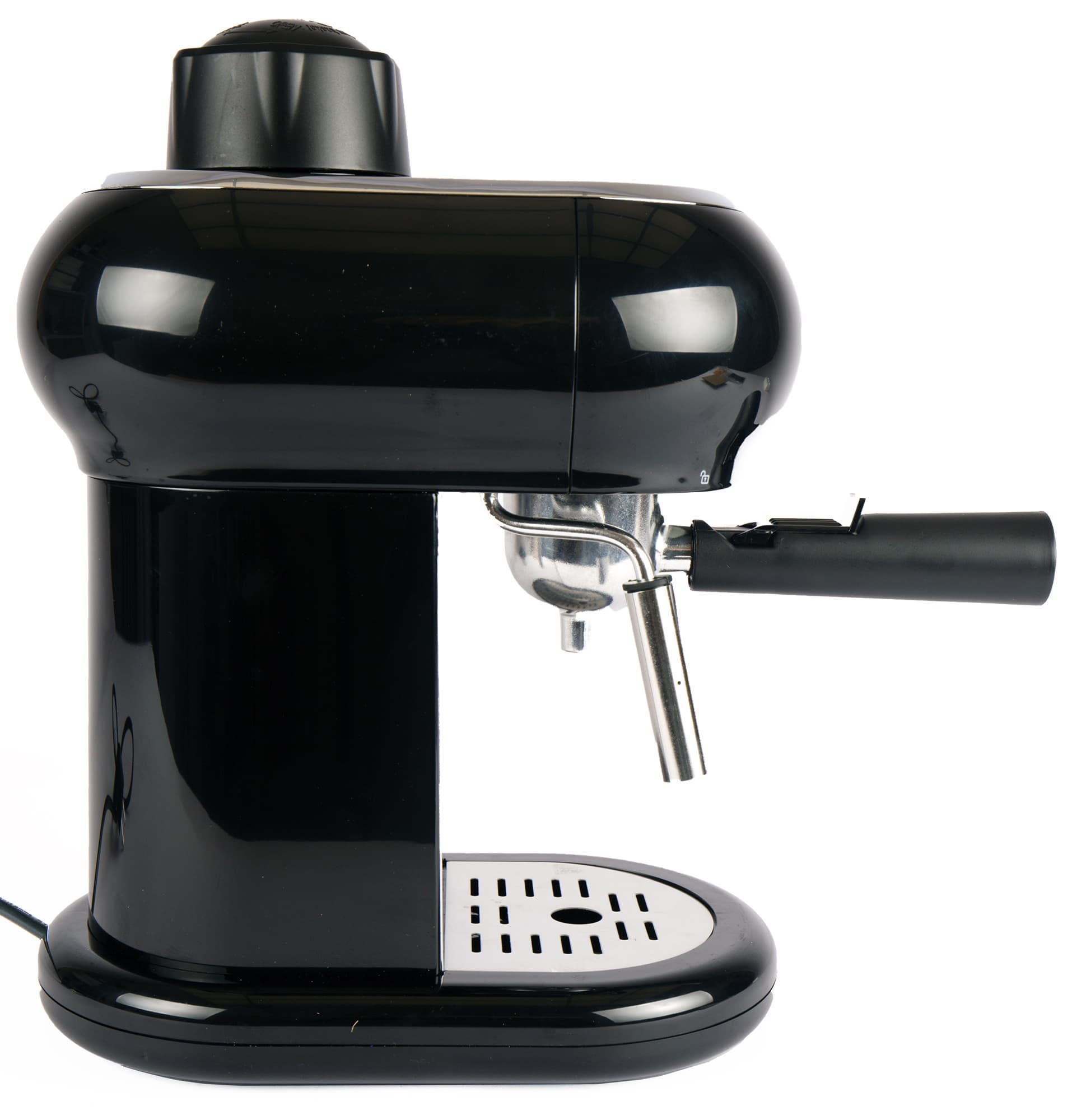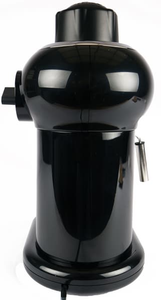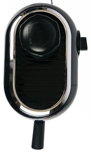 Давайте рассмотрим прибор со всех сторон и отметим его характерные особенности. Итак, перед нами кофеварка с рожком, но без помпы. Слева у нее расположено сопло капучинатора, сверху — пробка нагревательной камеры, справа — ручка для управления.