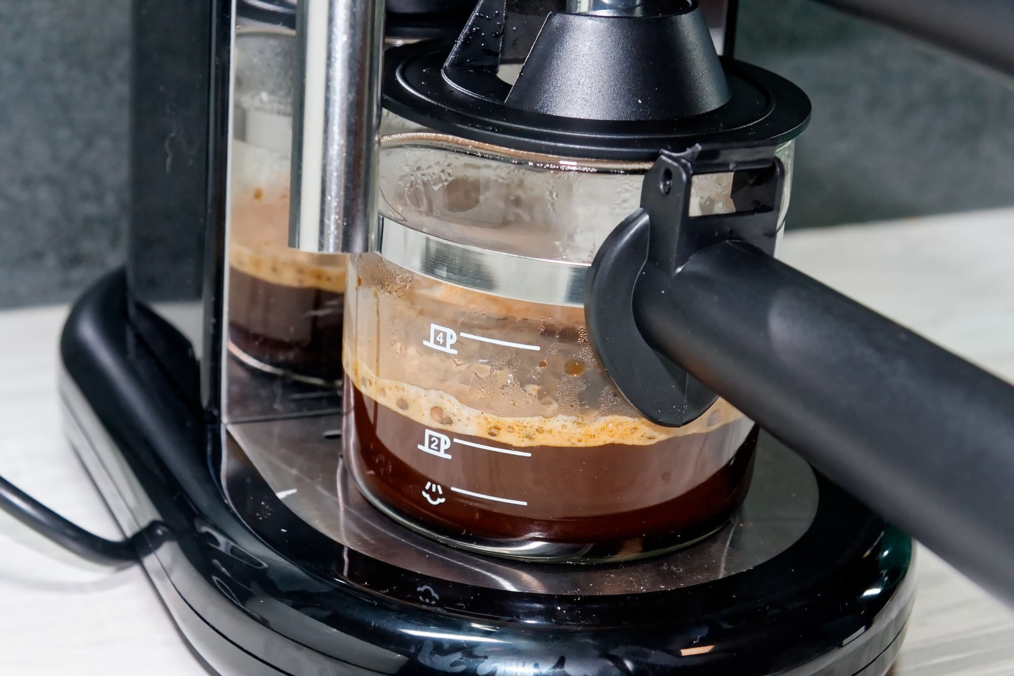 Кофе начал поступать в кувшин через 1 минуту 5 секунд, общее время приготовления составило примерно 1 минуту 45 секунд. Температура напитка в кувшине составила 70 °C.