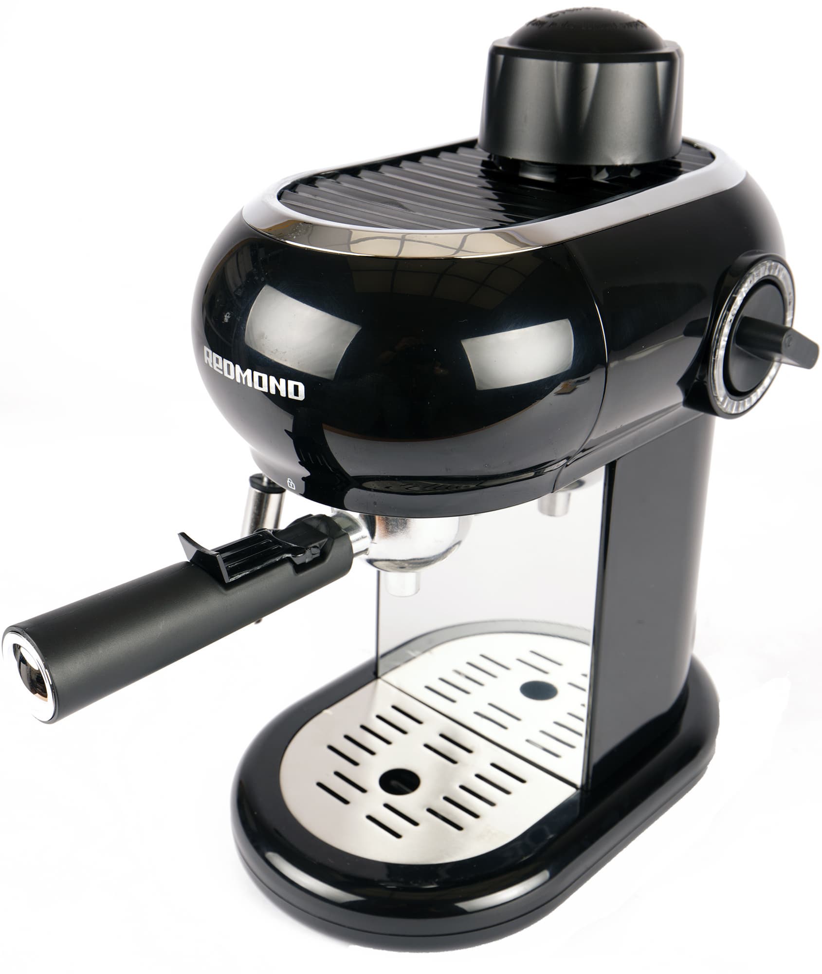 Redmond RCM-1521 представляет собой знакомый нам тип кофеварок, оснащенных рожком, но не имеющих помпы. Таким образом, прибор сочетает в себе черты капельной кофеварки (имеет кувшин и готовит напиток при низком давлении) и рожковой (оснащен рожком с фильтром, через который проливается вода). В нашей тестовой лаборатории уже бывали подобные устройства (например, Redmond RCM-1524), поэтому, приступая к тестированию, мы в целом мы уже представляли, чего ждать.