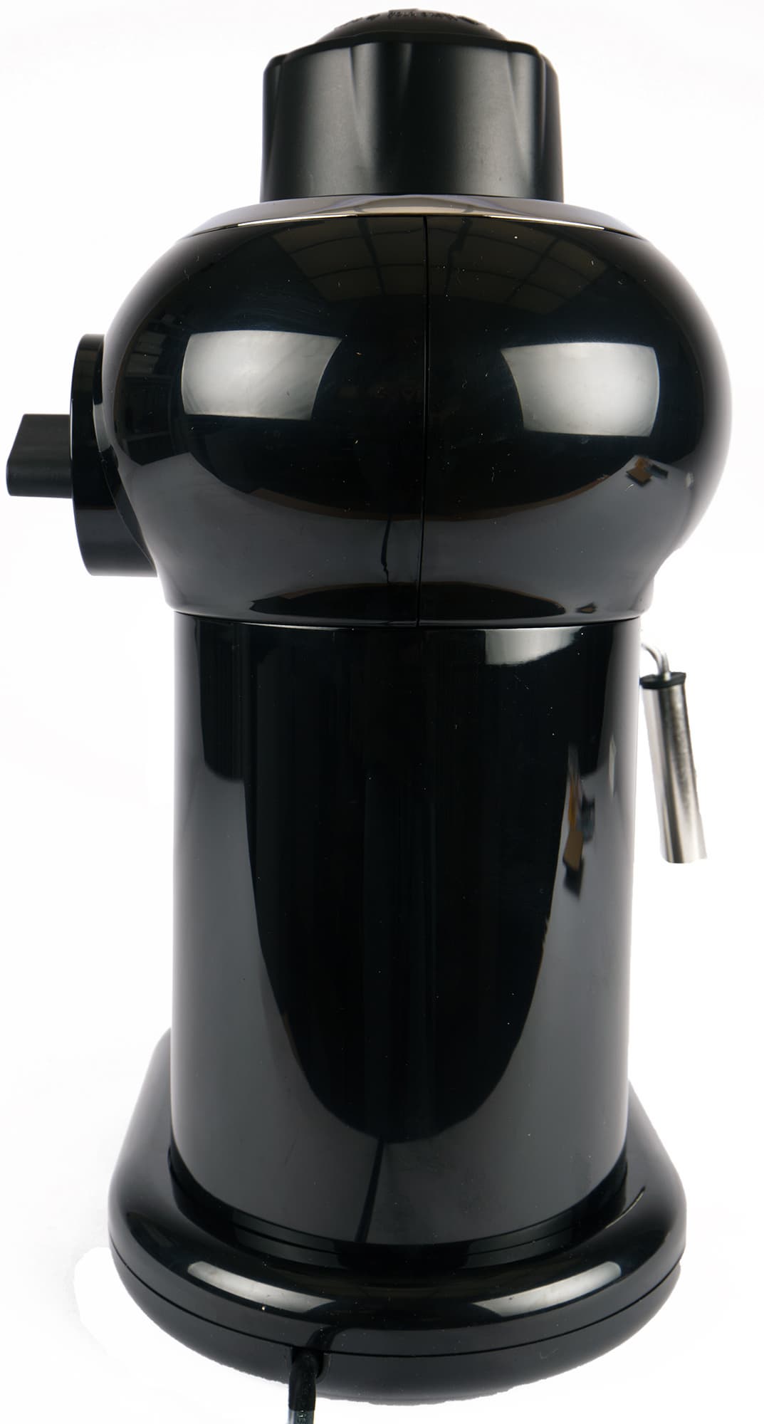 Вид слева: нас тут интересует в первую очередь капучинатор. Он представляет собой трубку, которую можно поворачивать влево и вправо (вверх и вниз нельзя!). На основную трубку надевается и фиксируется с помощью резинки дополнительная насадка — трубка большего диаметра. Ее легко снять (например, для очистки).