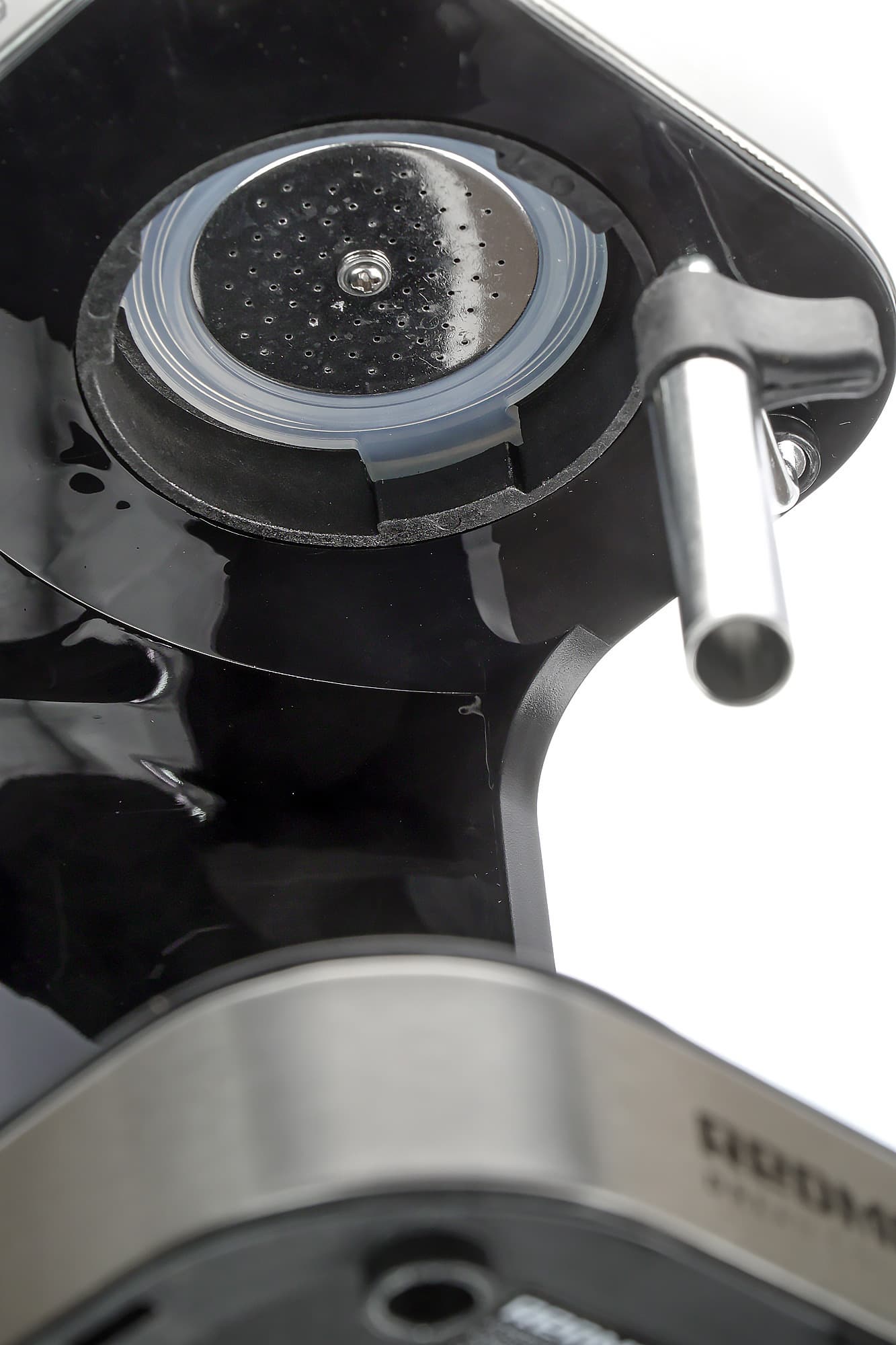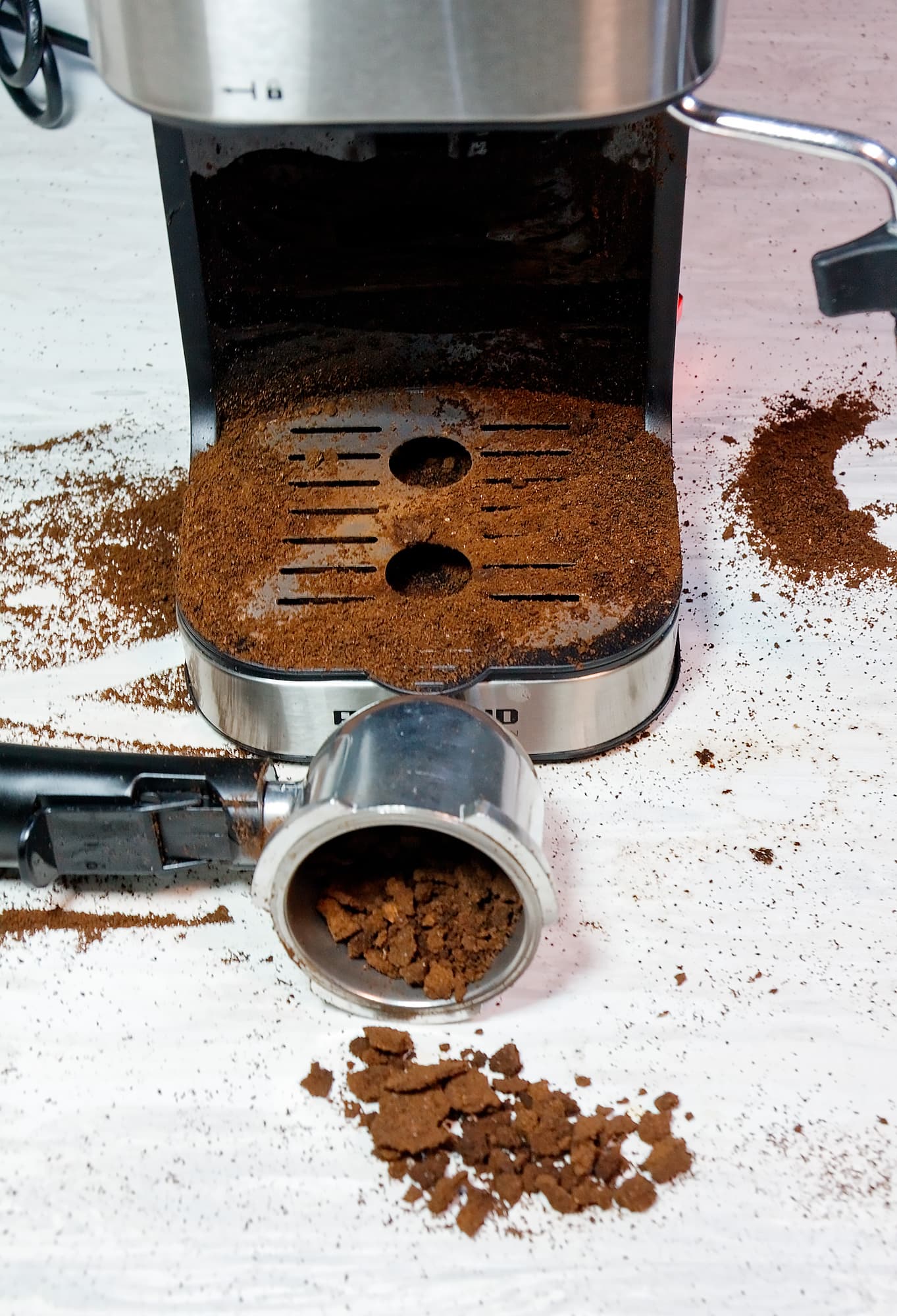 В-третьих, наверняка всех интересует вопрос: что же случится, если не сбросить давление и попытаться снять рожок преждевременно? К удовольствию читателей, мы проделали и этот трюк. Рассеянный любитель кофе, не соблюдающий технику безопасности, сможет лично увидеть, как рожок срывает с характерным хлопком, а содержимое рожка разлетается по всей рабочей поверхности.