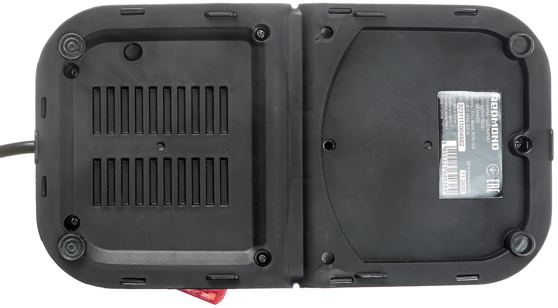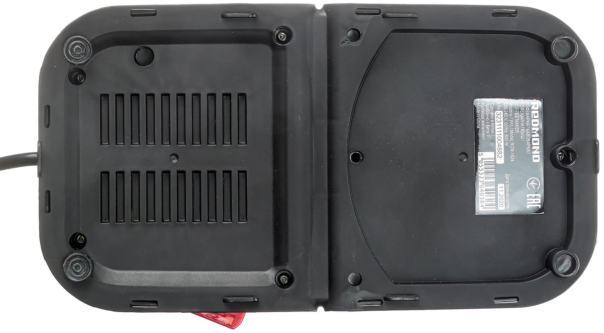Снизу у прибора имеются две резиновые нескользящие ножки и несколько пластиковых. Там же расположена наклейка с технической информацией и вентиляционные отверстия. Отсека для намотки излишков шнура питания не предусмотрено.