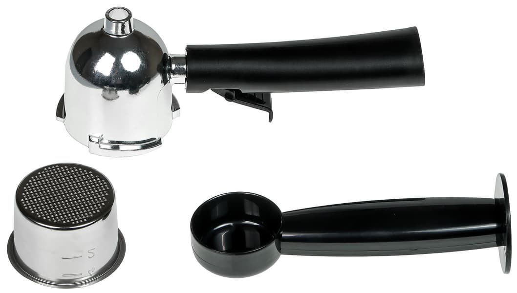 Рожок оснащен пластиковой ручкой с откидным пластиковым держателем, фиксирующим фильтр (чтобы он не выпал когда пришла пора вытряхнуть отработанный кофе). Никаких «улучшайзеров» у рожка не предусмотрено: довольно глубокий фильтр имеет перфорированное дно и отметки, соответствующие двум и четырем «порциям» (с ними мы разберемся позже). Материал рожка — легкий металл.