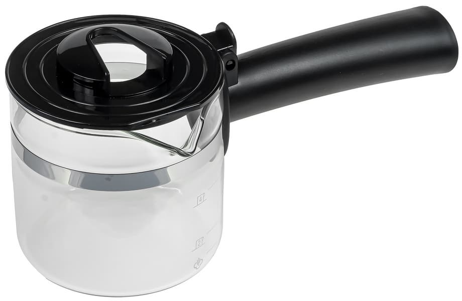 Наконец, в комплекте обнаружился миниатюрный стеклянный кувшин. Он имеет пластиковую ручку (точно такую же, как у рожка) и пластиковую же крышку. На стеклянной колбе нанесена градуировка, с помощью которой можно отмерить 2 или 4 чашки напитка. Пластиковая крышка имеет характерное углубление, рассчитанное на «стыковку» с рожком. Никакой антикапельной системы тут не предусмотрено — кофе будет подаваться сразу в кувшин через отверстие в крышке.