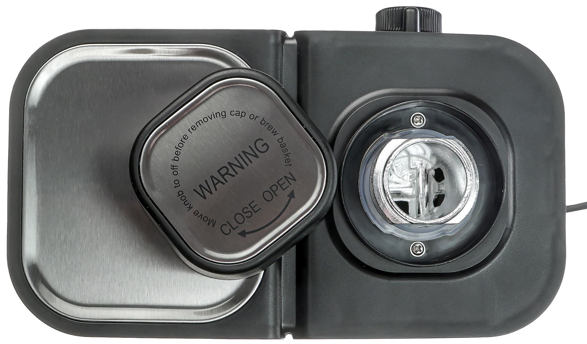 Наконец, на верхней грани нашей кофеварки расположена подставка для чашек и массивная пробка, закрывающая контейнер для воды. Пробка плотно фиксируется с помощью резьбового соединения. Герметичность реализована благодаря резиновой прокладке. Сверху на крышке находится наклейка с предупреждением о необходимости предварительно сбросить давление. Несмотря на то, что у нашей кофеварки давление заявлено всего в 4 бар, предупреждение явно не лишнее: судя по всему, если пренебречь данной рекомендацией, можно легко обжечься паром.