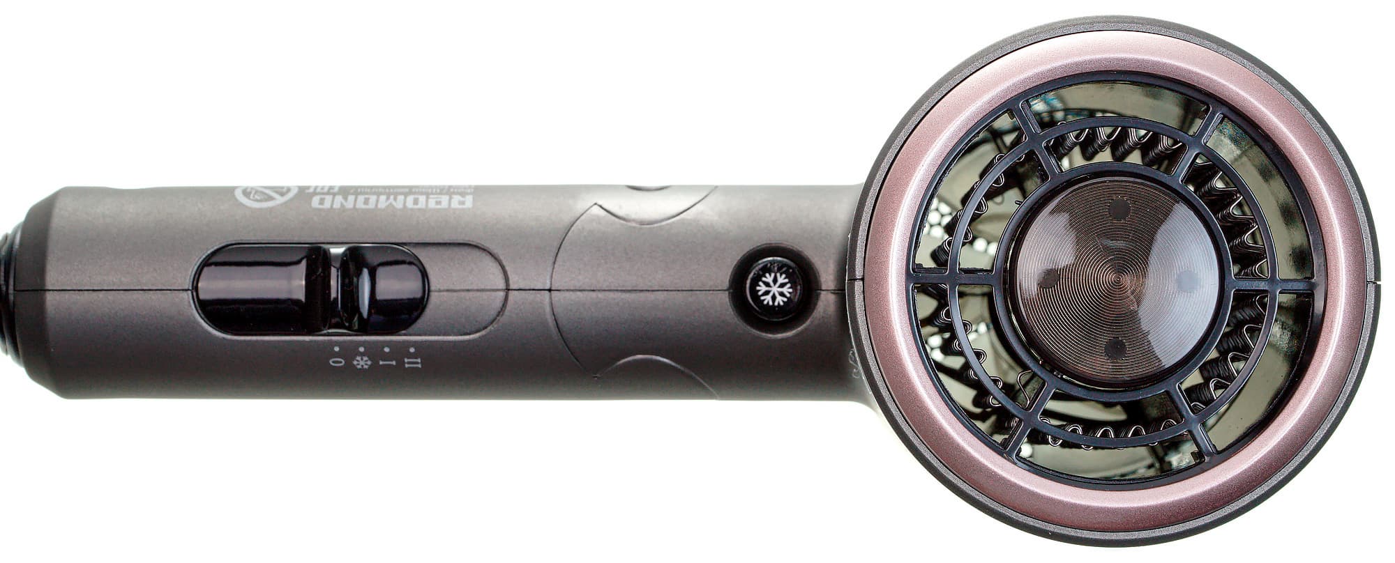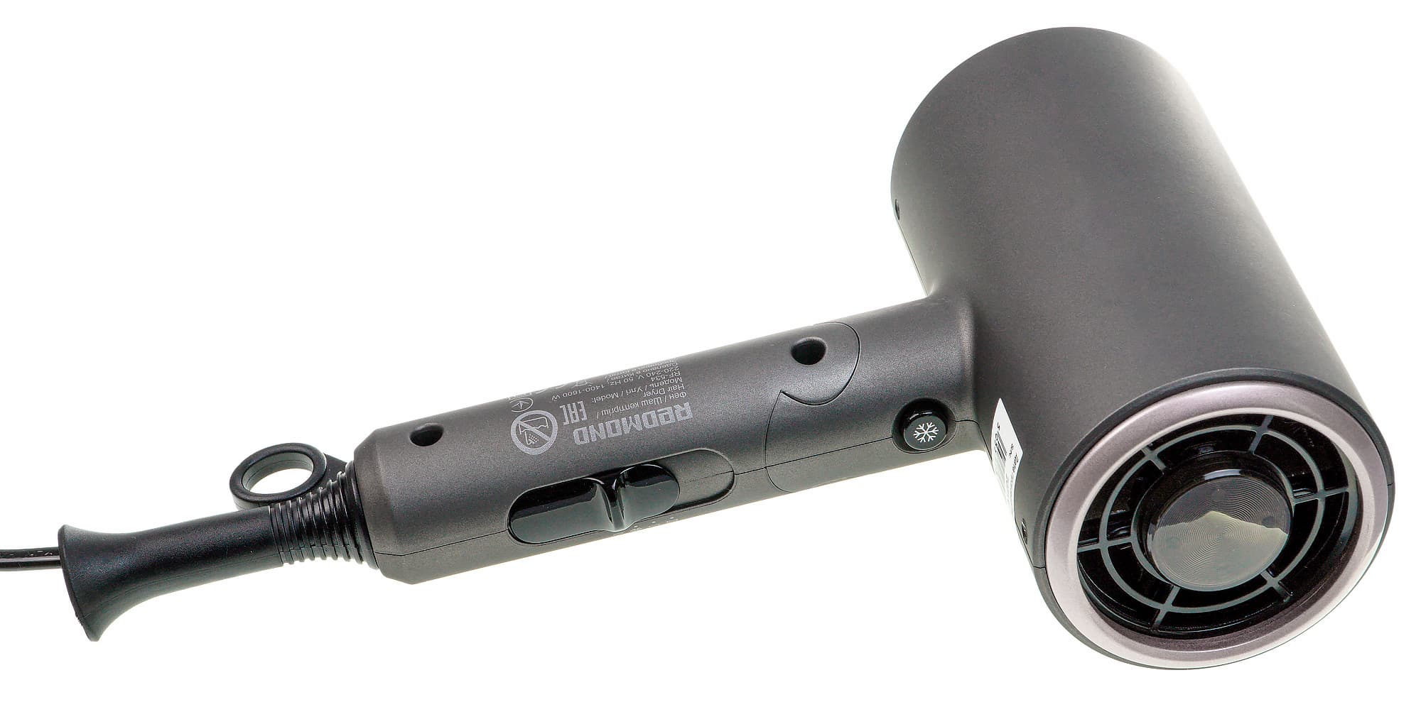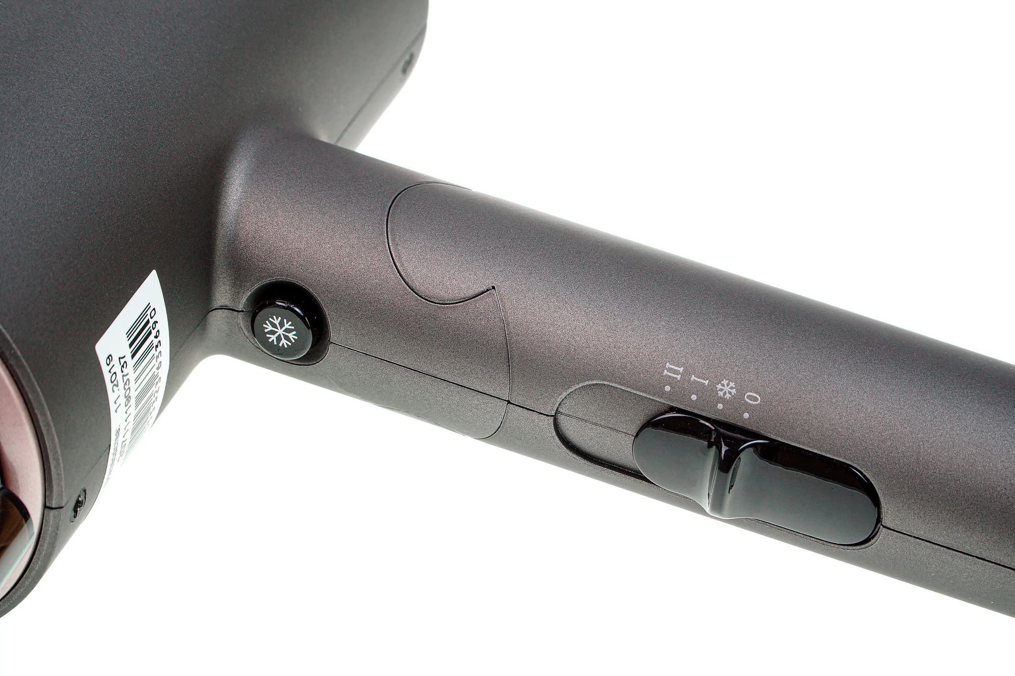 С внутренней стороны ручки находится переключатель режимов и кнопка подачи холодного воздуха. Шнур электропитания крепится в нижней части ручки. Шнур тонкий и легкий. Место соединения защищено гибким пластиковым кожухом длиной 6 см, в котором выделена петля для подвешивания. На боковой стороне ручки нанесена техническая информация о приборе.