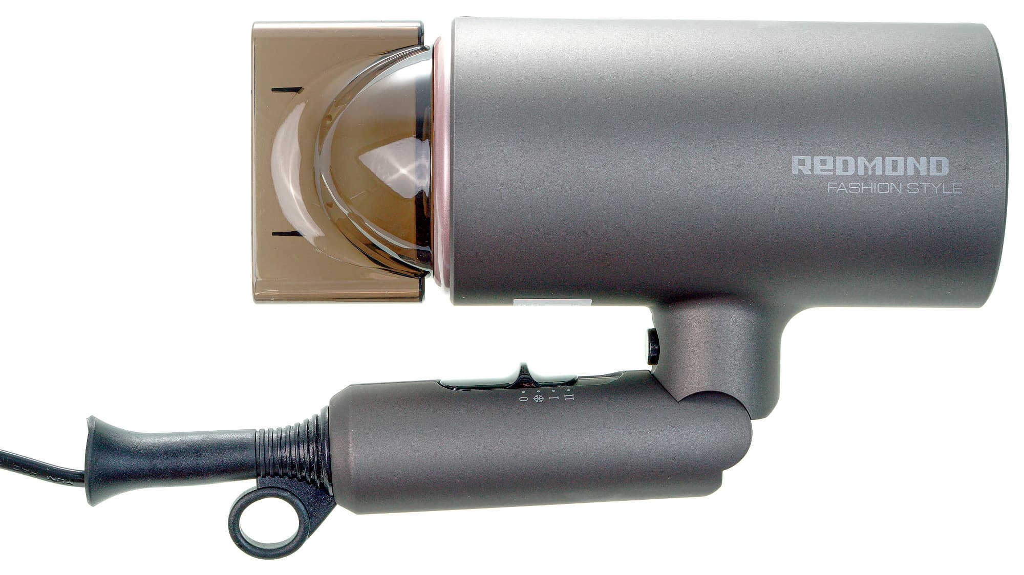 Фен Redmond RF-534 оснащен насадкой-концентратором — единственной действительно нужной, по нашему мнению, насадкой. Выполнена деталь из прозрачного затемненного пластика, имеет, в целом, стандартную форму. Для крепления на корпусе необходимо совместить ее края со вставкой по периметру сопла и надавить до легкого щелчка. Снимается концентратор, если за него потянуть. Жестко на корпусе не фиксируется, по окружности вращается с определенным усилием, не скользит.