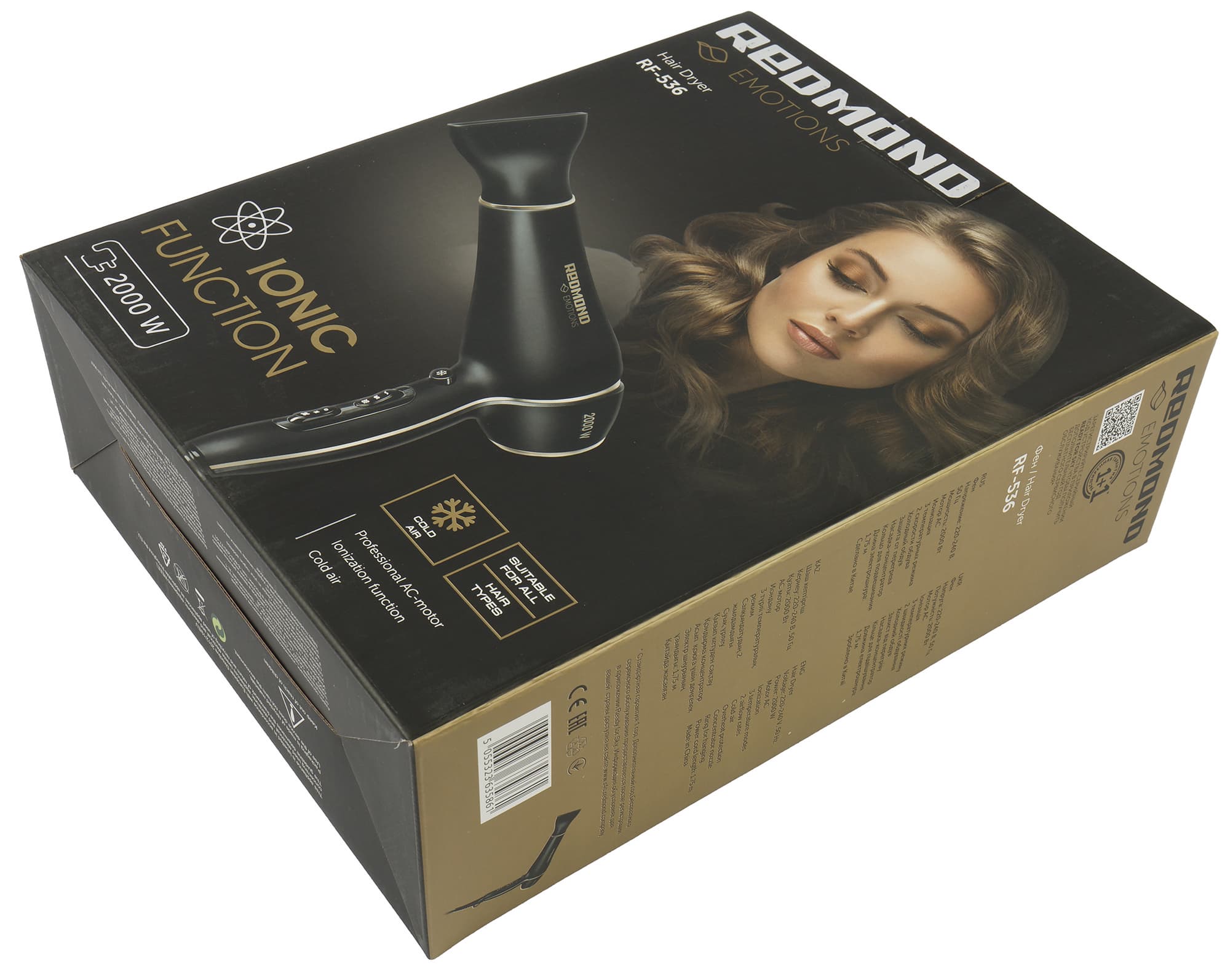Фен поставляется в небольшой картонной коробке, оформленной в лучших традициях Redmond — на черном фоне красотка с идеально уложенными волосами, фото самого устройства, а также логотип компании, название модели и обозначения ее основных преимуществ. Боковые грани упаковки содержат более подробную информацию об особенностях фена и его технических характеристиках.