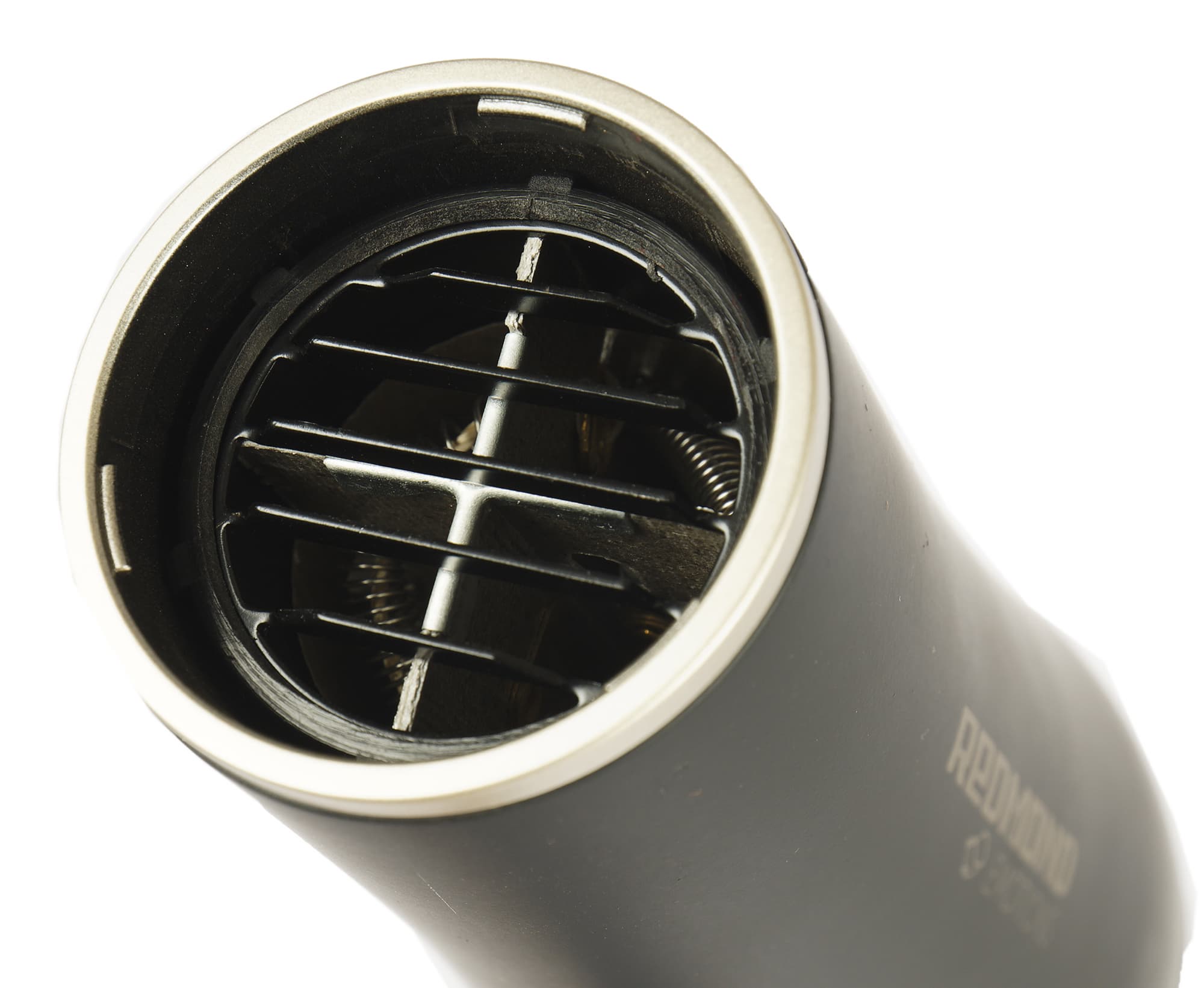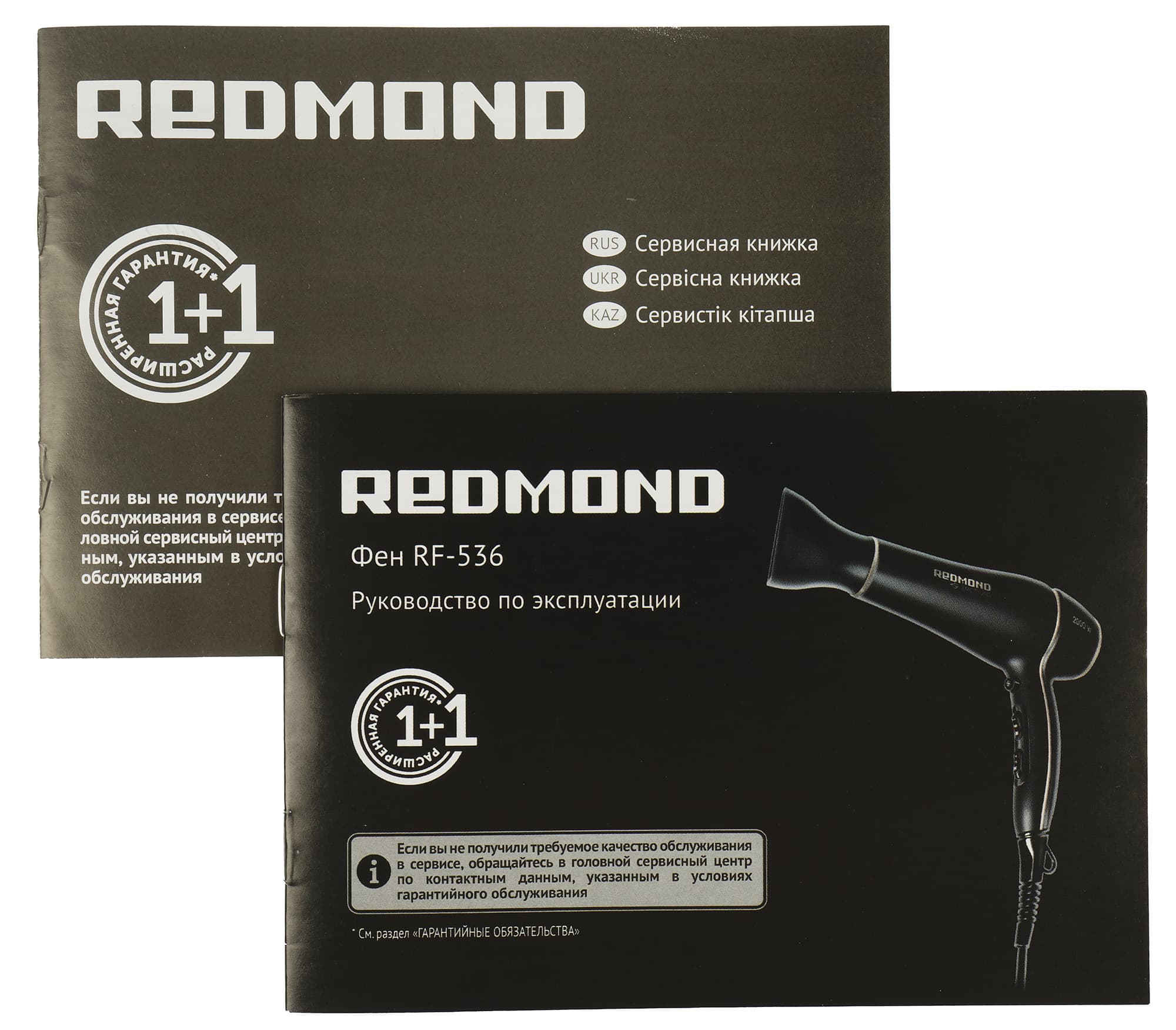 Ручка не скользит и удобно располагается в ладони. Несмотря на то, что она не складывается Redmond RF-536 не выглядит громоздким. Длина цилиндрического корпуса, сужающегося в области сопла, без насадки составляет 22 см, длина ручки вместе с защитным кожухом шнура — 21 см. Весит фен 800 г.