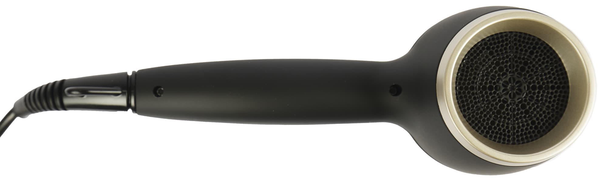 Плавные линии фена, покрытого приятным на ощупь материалом soft touch делают его весьма привлекательным и изящным. Строгость черного корпуса разбавлена вставками бежево-золотистого цвета.