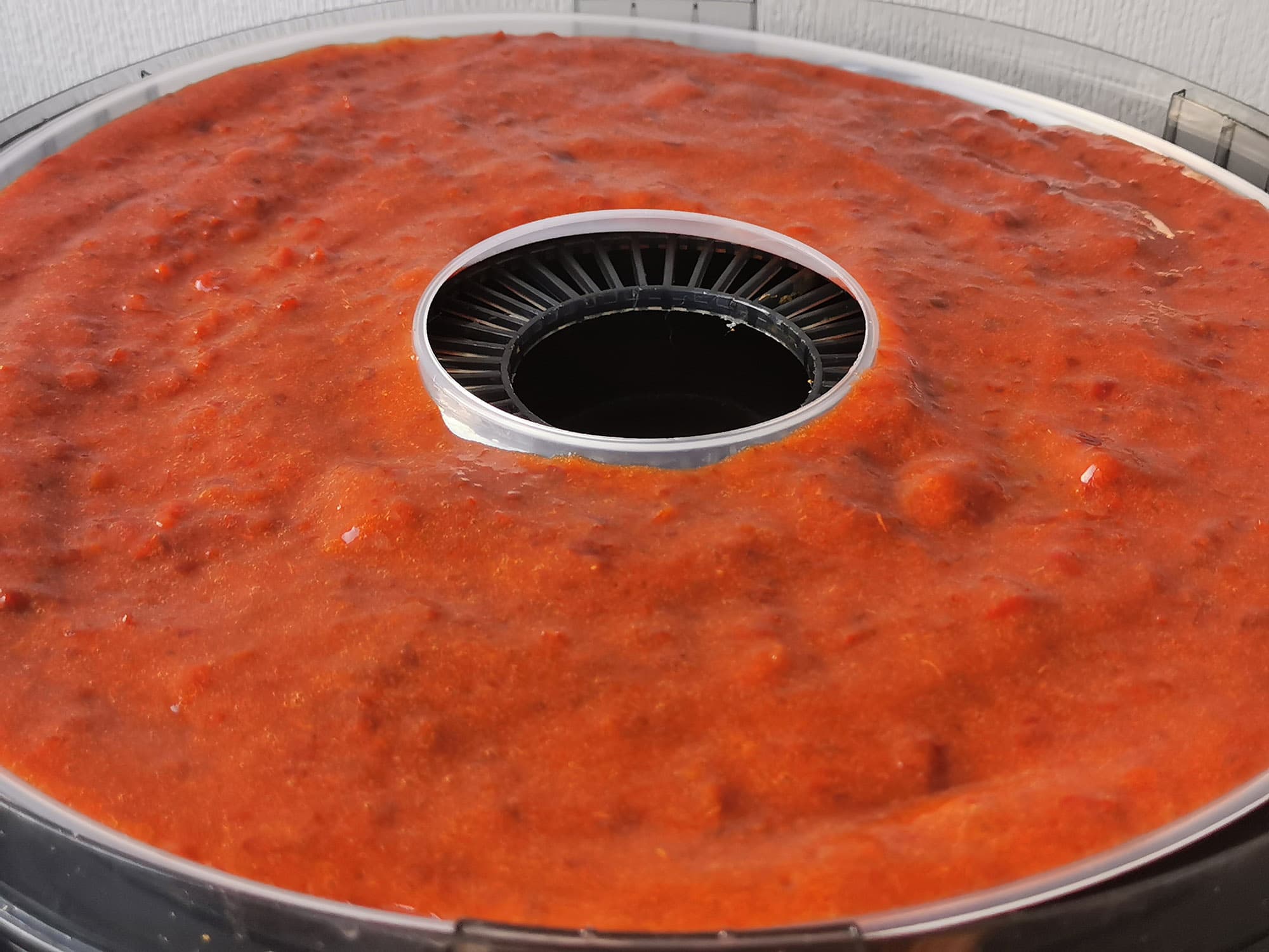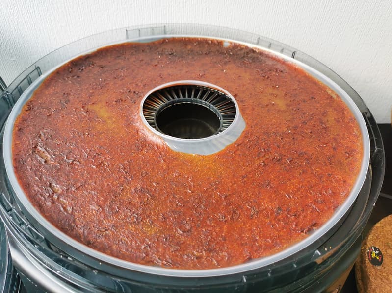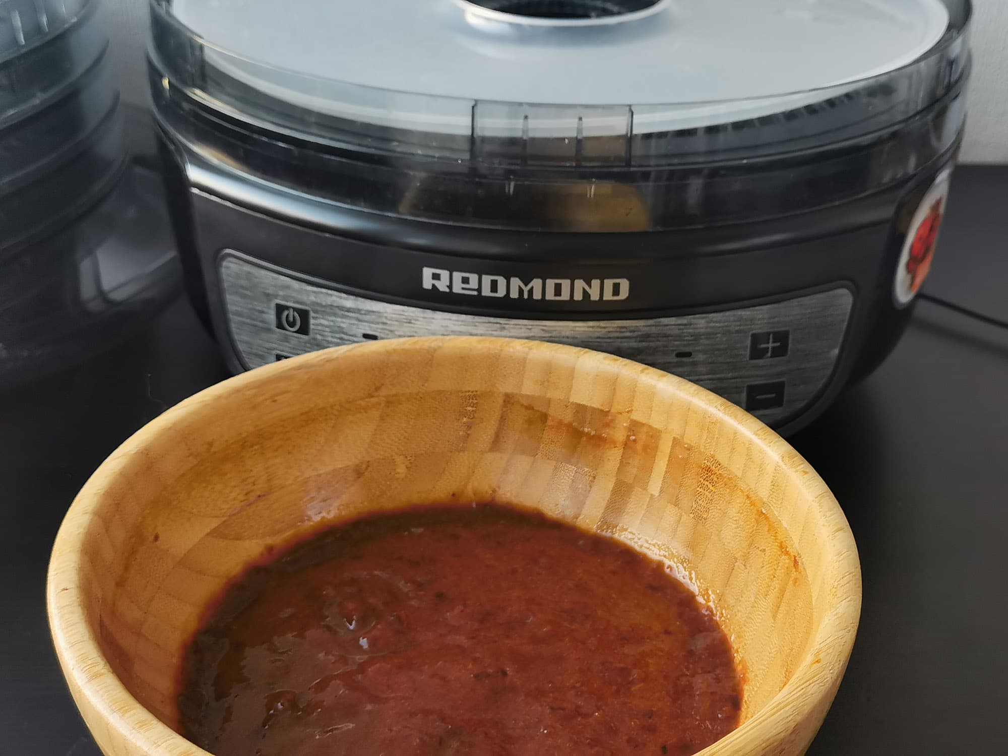 Наша фруктовая масса получилась густой и мы легко равномерно размазали ее по поддону для пастилы. Жаль, что в комплекте он только один, так как, конечно, при столь длительной сушке (у нас вышло 6 часов), хотелось бы получить как можно больше готового продукта.