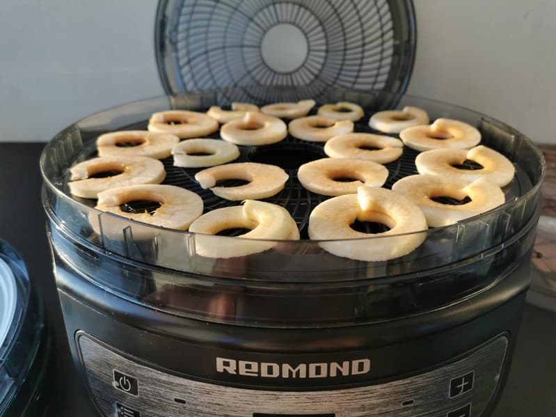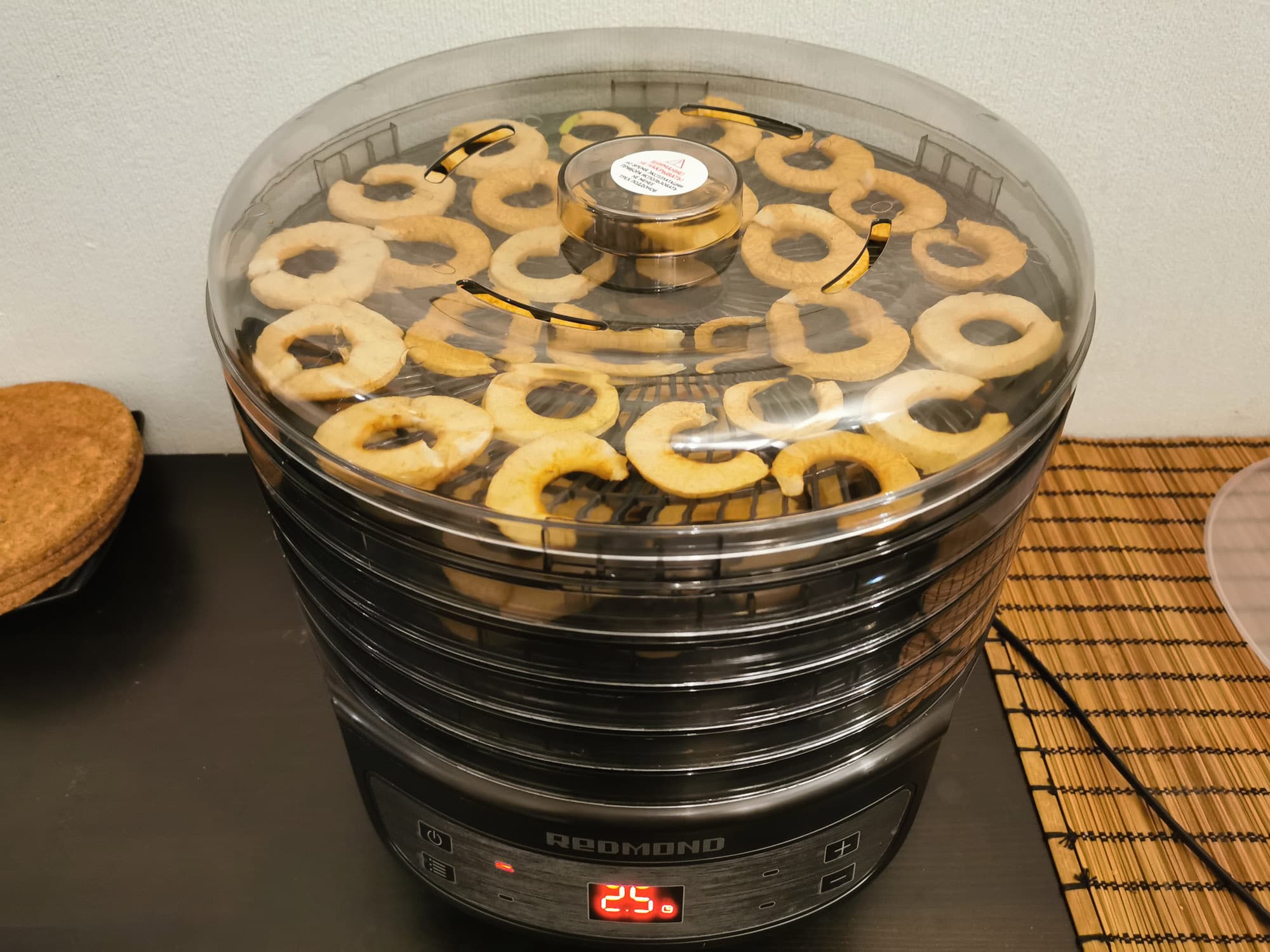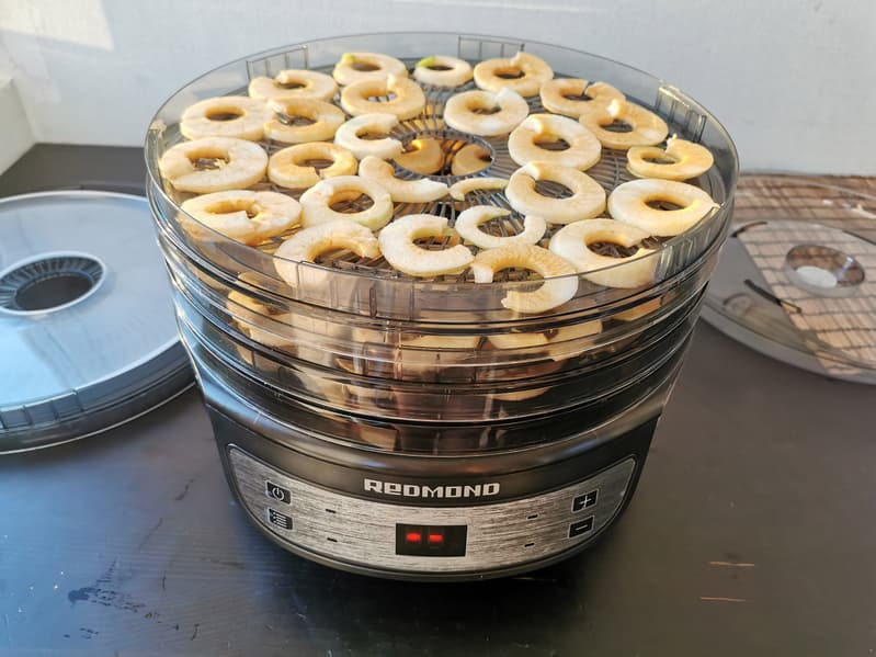 В течение всего процесса дегидрации мы меняли лотки с яблоками местами, чтобы они просушивались равномернее.