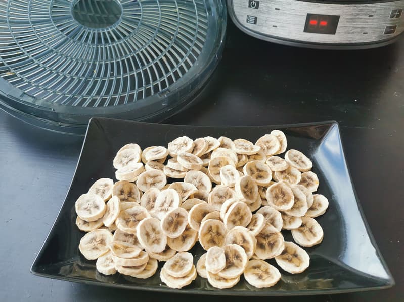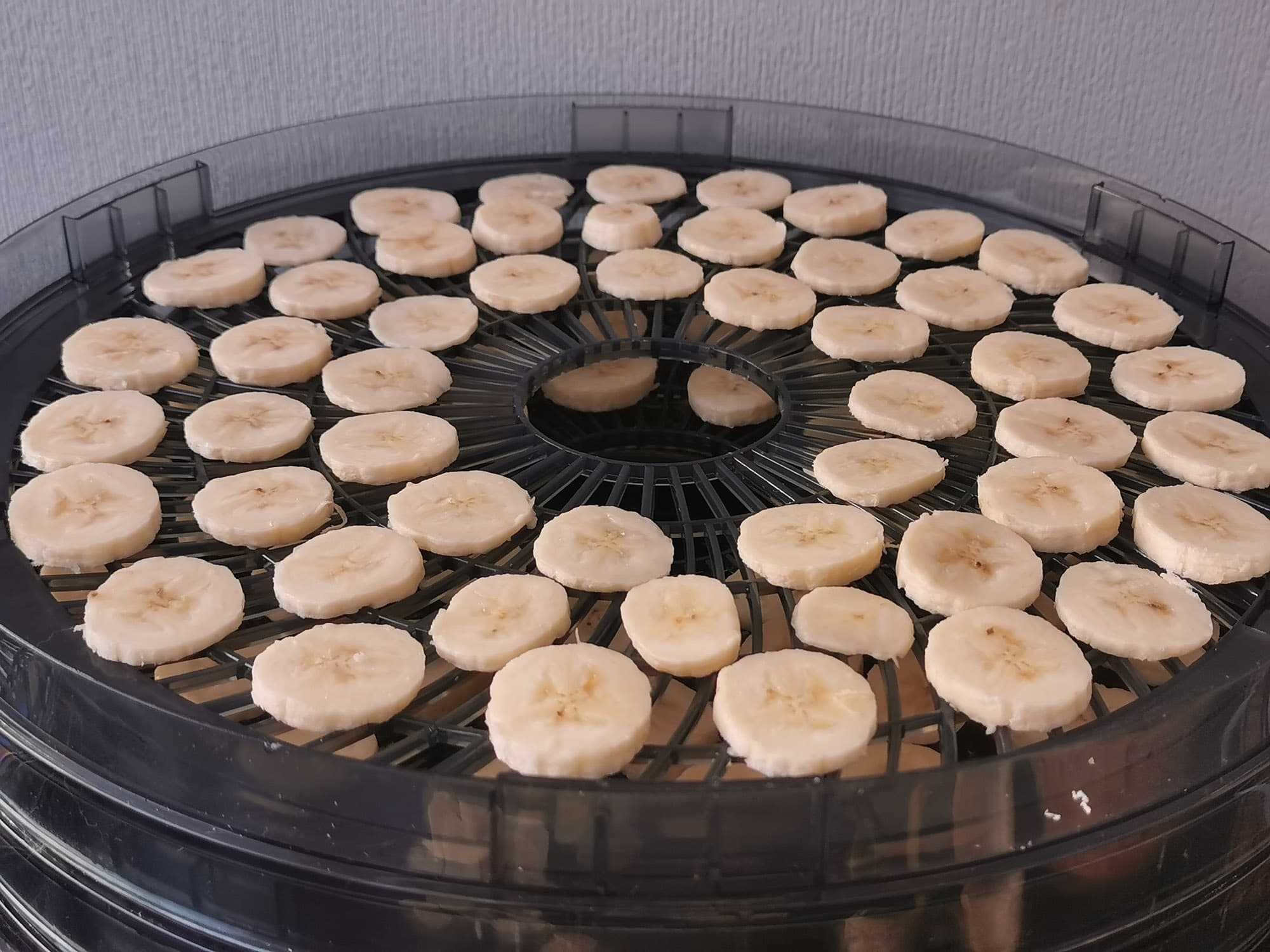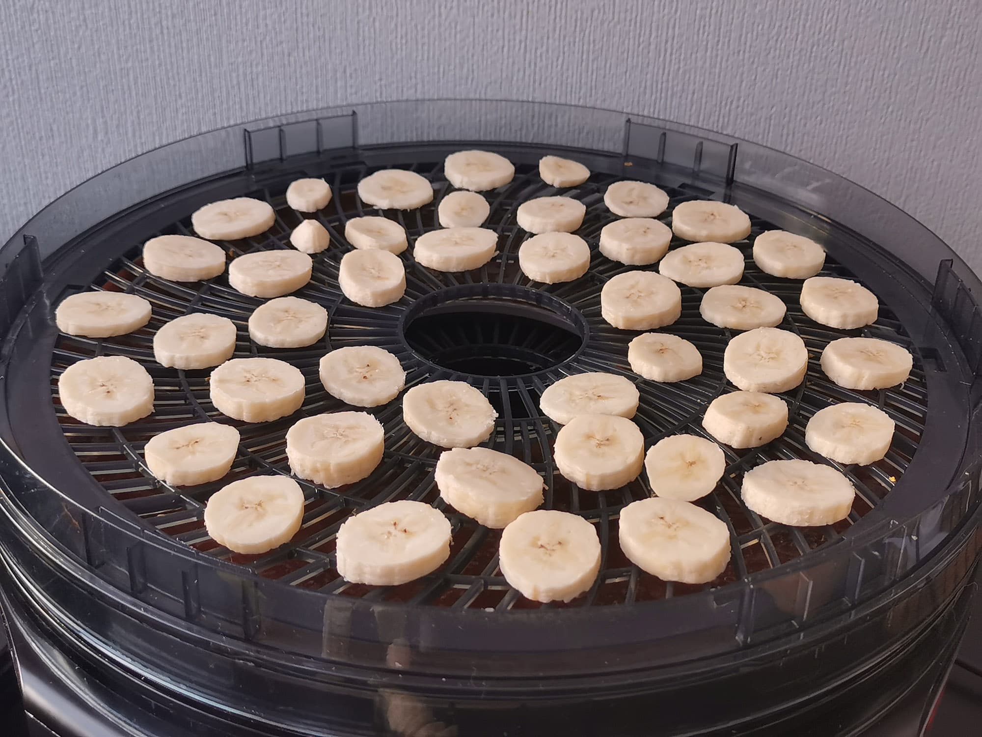 Для теста мы взяли несколько крупных бананов, порезали их на тонкие кружки и свободно разложили по лоткам.