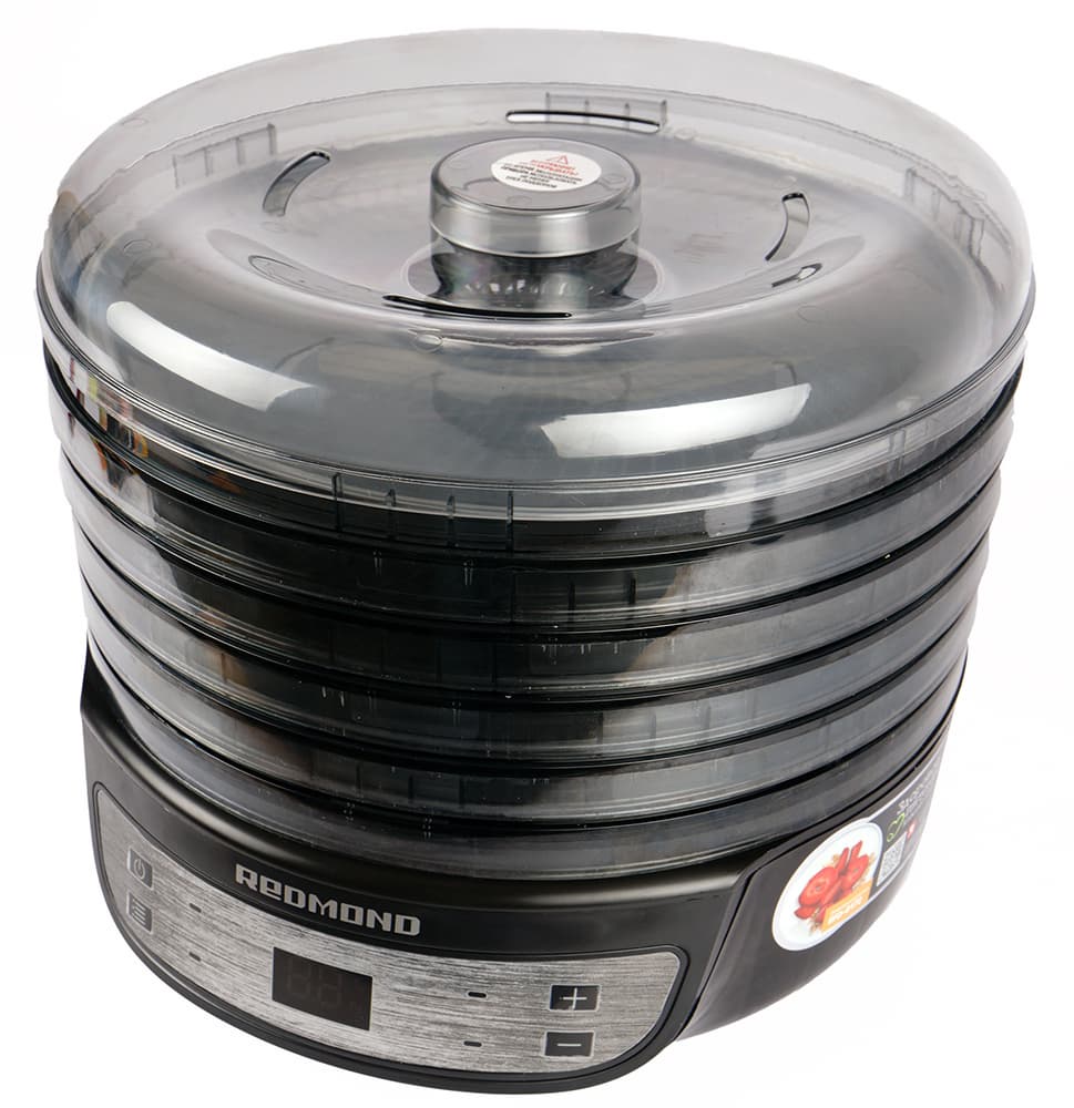 Вынув дегидратор из коробки, мы были приятно удивлены его стильному внешнему виду. Корпус выполнен из черного пластика, а на панель управления нанесена наклейка, имитирующая сталь, все 5 пластиковых ярусов имеют серый оттенок, только крышка устройства осталась полностью прозрачной.