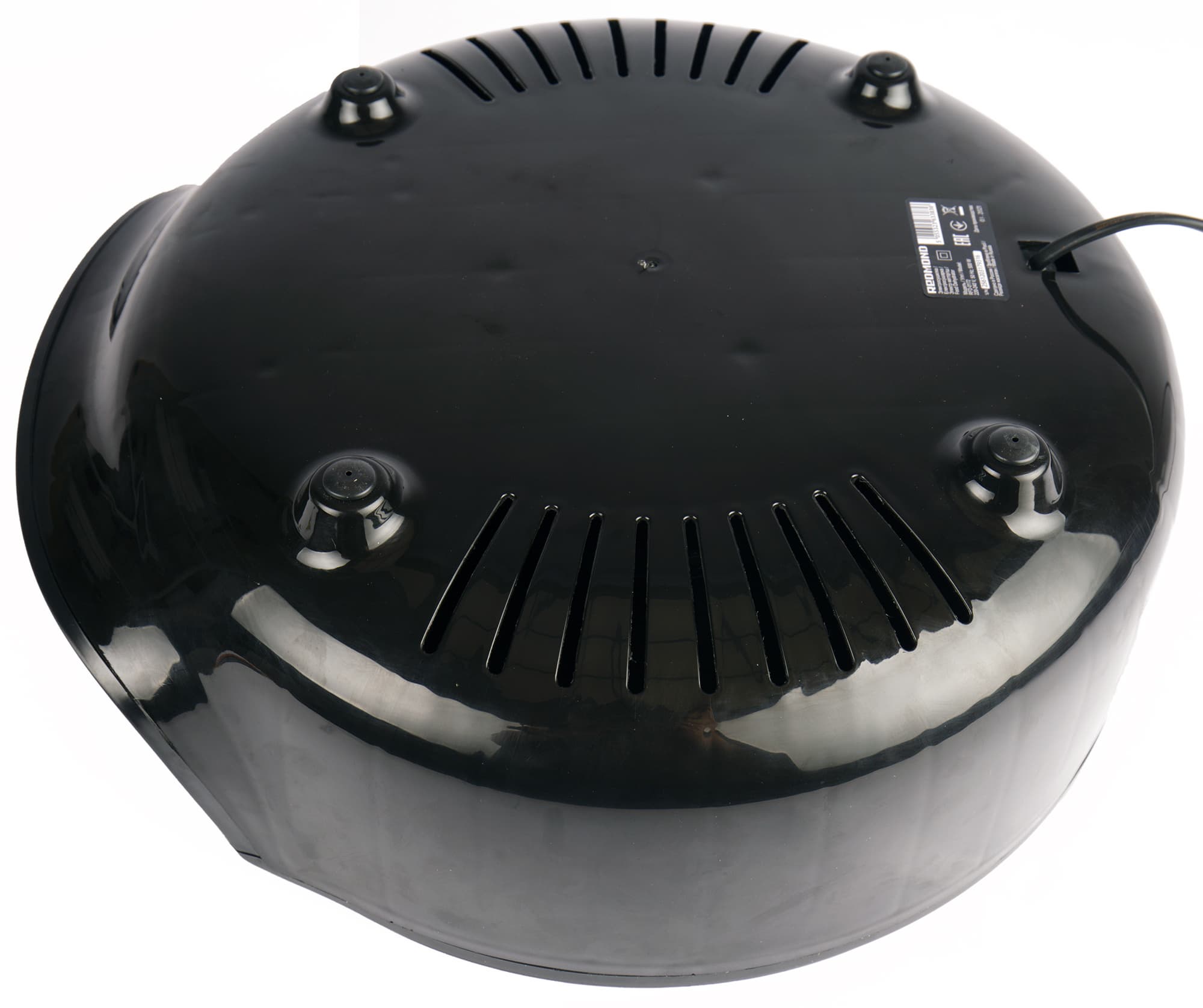 На дне корпуса находятся два вентиляционных отверстия и четыре прорезиненные ножки. Между задними ножками расположен шильдик с краткой технической информацией о приборе, а чуть ближе к краю выходит шнур электропитания.