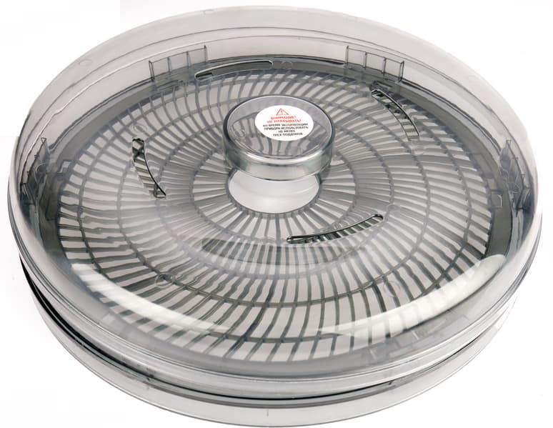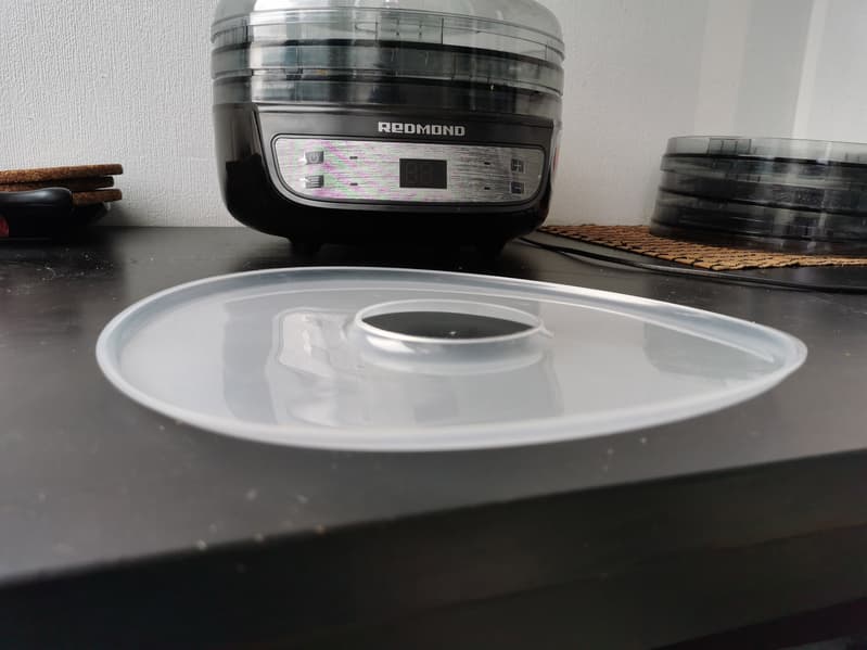 Верхняя часть корпуса не снимается, на нее могут упасть продукты во время сушки (например, у нас туда провалились мелкие кусочки рыбы). Часть таких отходов можно собрать салфеткой, а чтобы вытряхнуть более мелкие кусочки (зелень, крошки хлеба), придется переворачивать основание сушилки целиком.